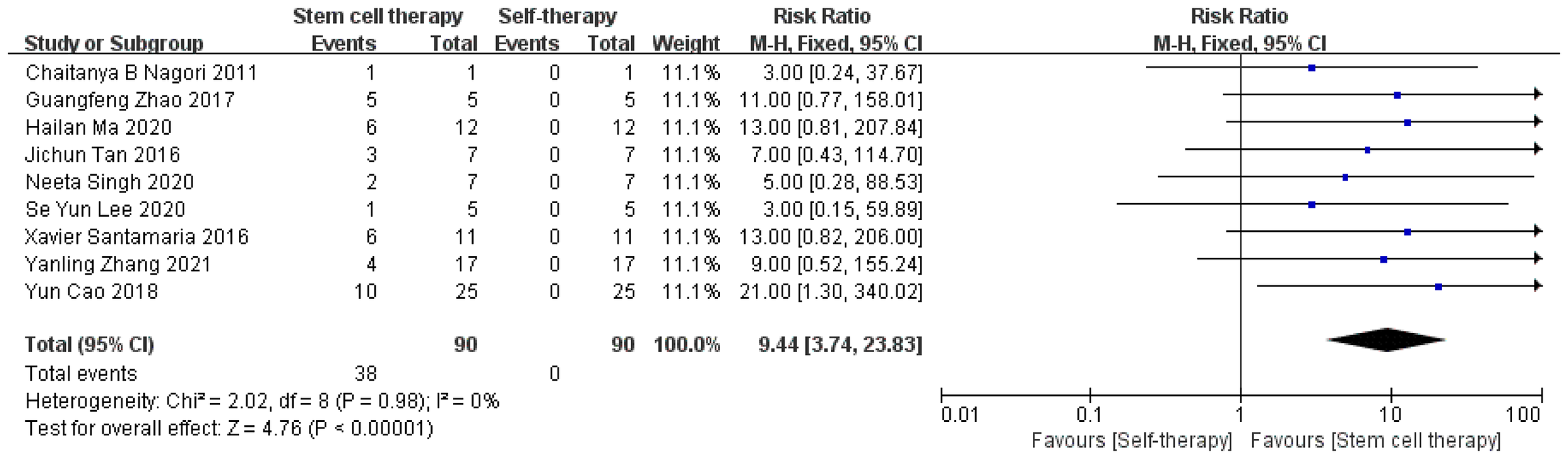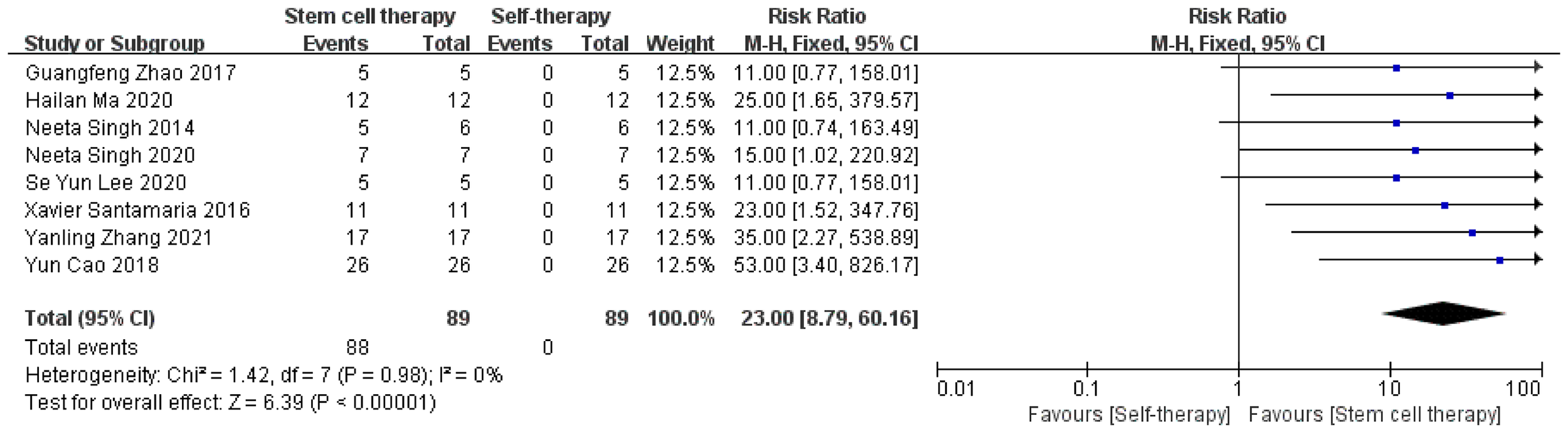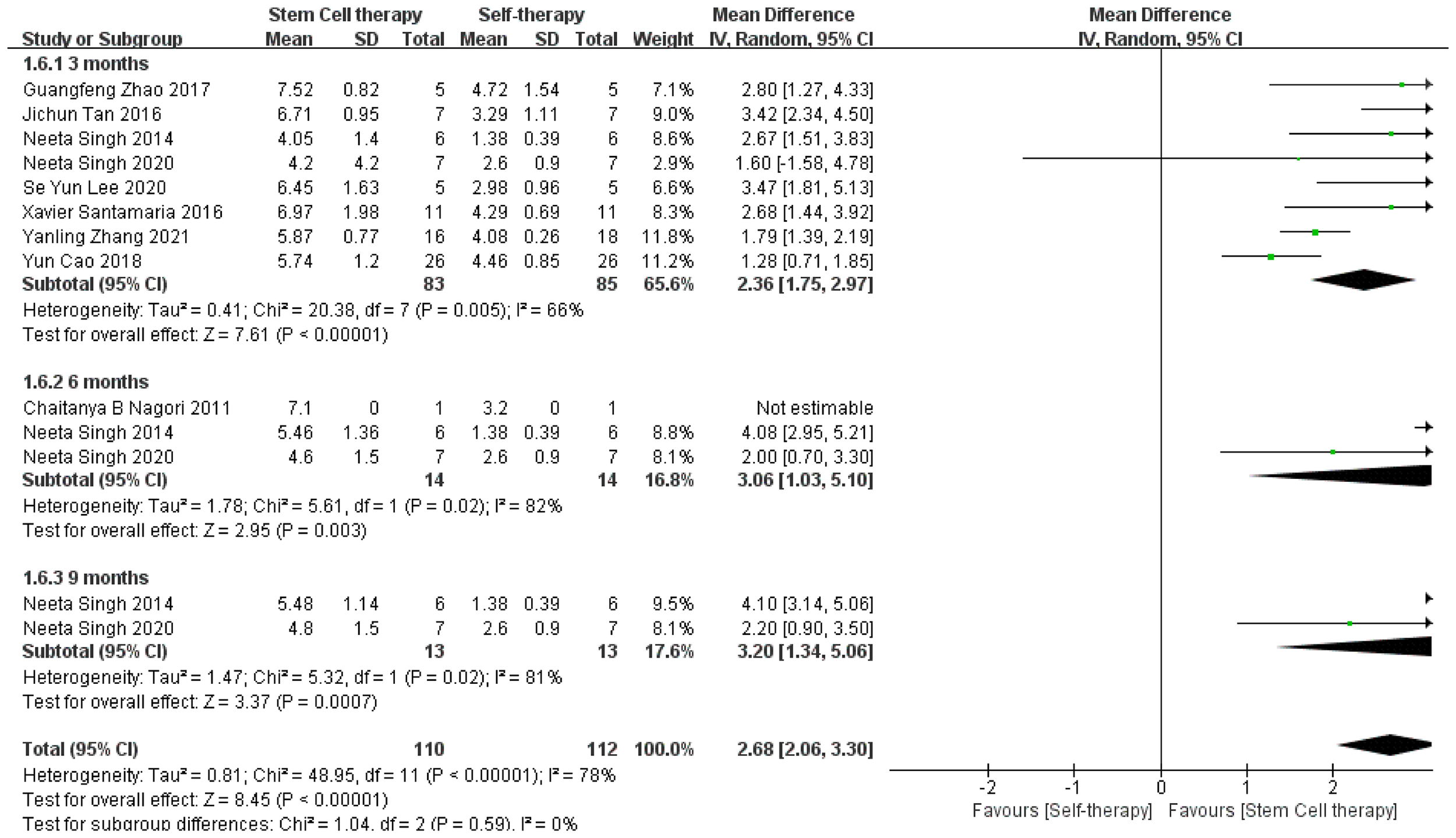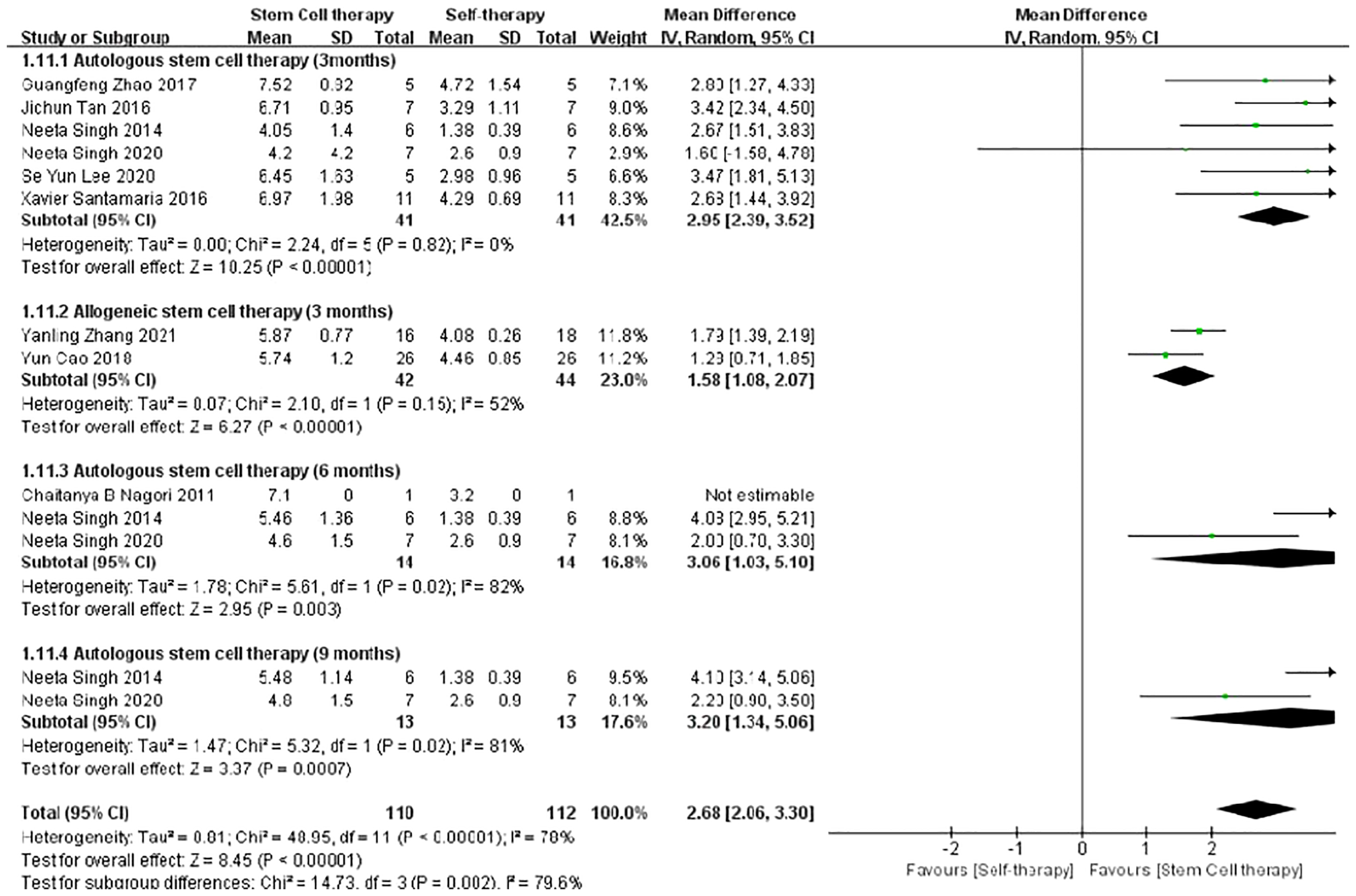 All meta-analysis were performed using Review Manager 5.4 (Cochrane Collaboration, London, UK). First, according to the comparison before and after stem cell treatment, the patients were divided into a treatment and control group. The main binary variables were menstrual improvement after treatment and pregnancy, among others, represented by the relative risk (RR) and 95% confidence interval (CI). Continuous variables were as follows: change in endometrial thickness, represented by the mean difference. Second, according to the type of stem cells, patients were divided into autologous and allogeneic stem cell groups.