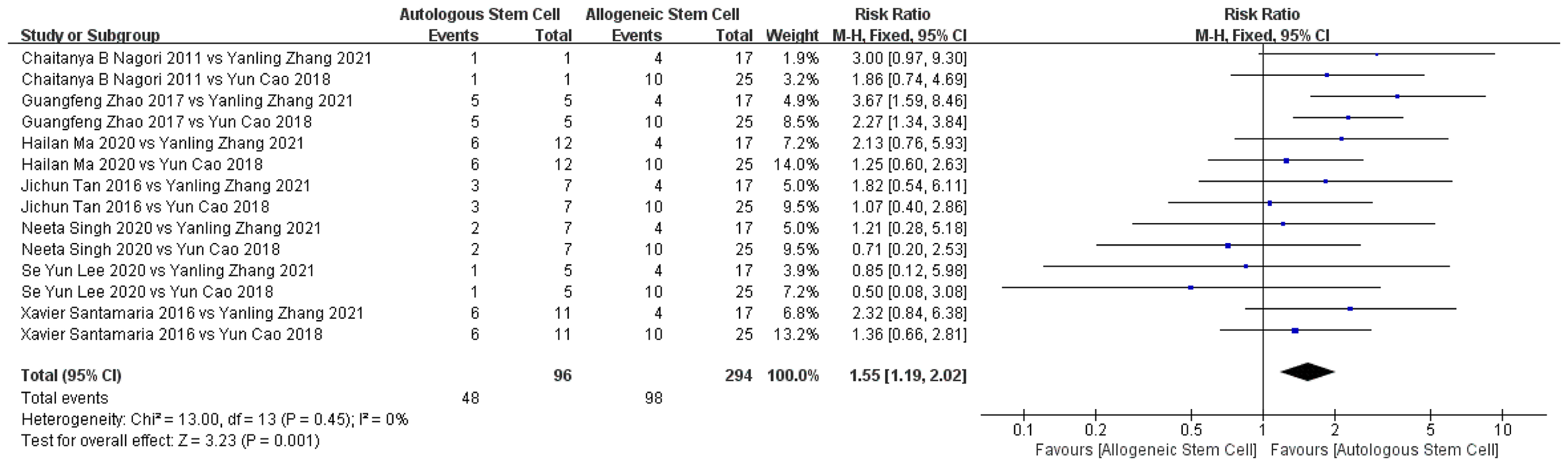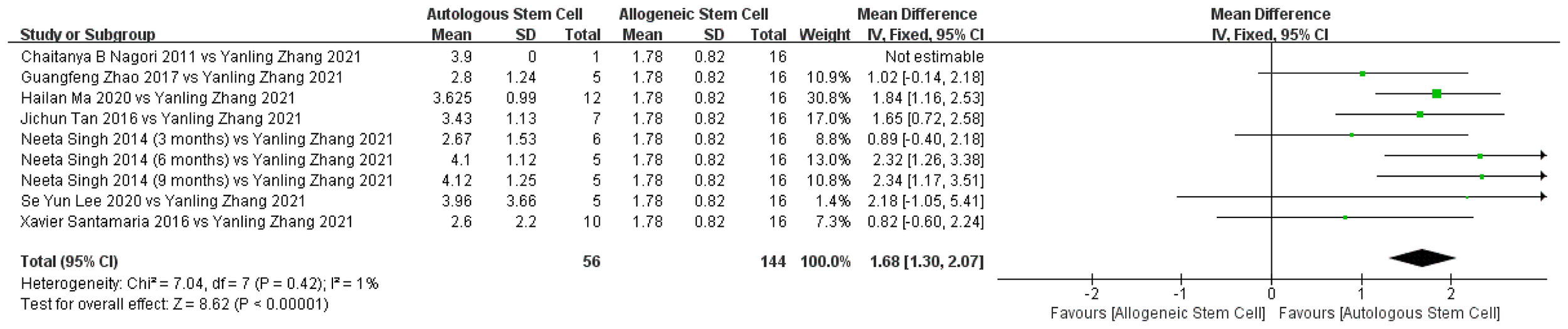 Our search returned 154 reports, 10 of which met the inclusion criteria, representing 116 patients. Of these, 44 patients in two studies were treated with allogeneic stem cells and 72 patients in eight studies were treated with autologous stem cells. Improvements in endometrial thickness and pregnancy rates after intrauterine device treatment were compared between the autologous and allogeneic stem cell groups. Endometrial thickness increased more after autologous stem cell IUA treatment (mean difference, 1.68; 95% confidence interval [CI]: 1.30–2.07; P < 0.00001), and the pregnancy rate was also improved (relative risk, 1.55; 95% CI: 1.19–2.02, P < 0. 001). No obvious and serious adverse reactions were observed during stem cell therapy in either group.