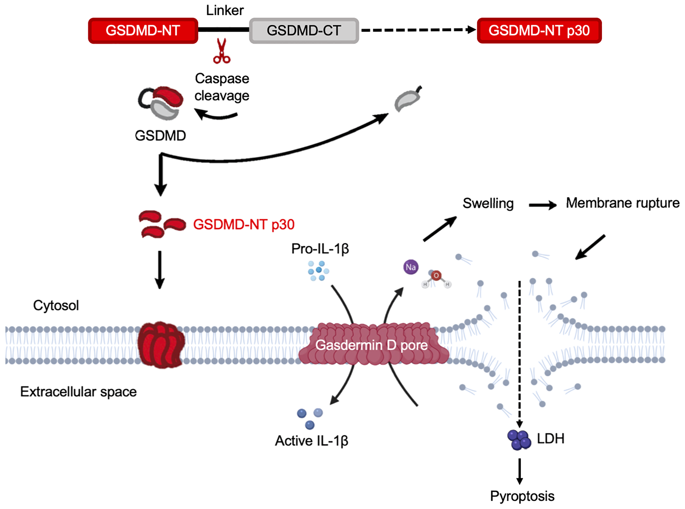 Gasdermin D functions as the executor of cell pyroptosis. Inflammatory caspases are activated by a wide array of inflammasomes upon sensing cytosolic contamination or perturbation. Upon activation, caspases cleave pro-IL-1β, pro-IL-18, and GSDMD. Full length GSDMD is composed of an NT effector domain, also known as pore-forming domain (red) and a CT repressor domain (grey). These two components are connected by a flexible link containing the caspase cleavage sites. The liberated NT pore-forming domain then inserts into the plasma membrane and triggers oligomerization of approximately 16 monomers to form a GSDMD pore. This is a relatively small pore allowing IL-1β to release through it. Simultaneously, sodium gets into the cell, bringing along water that increases cell volume. This can rapidly exceed the volume capacity of the cell, causing a big tear in the plasma membrane that is much larger in size than the GSDMD pore. This membrane-rupture event results in massive release of soluble cytosolic contents, including lactate dehydrogenase (LDH).