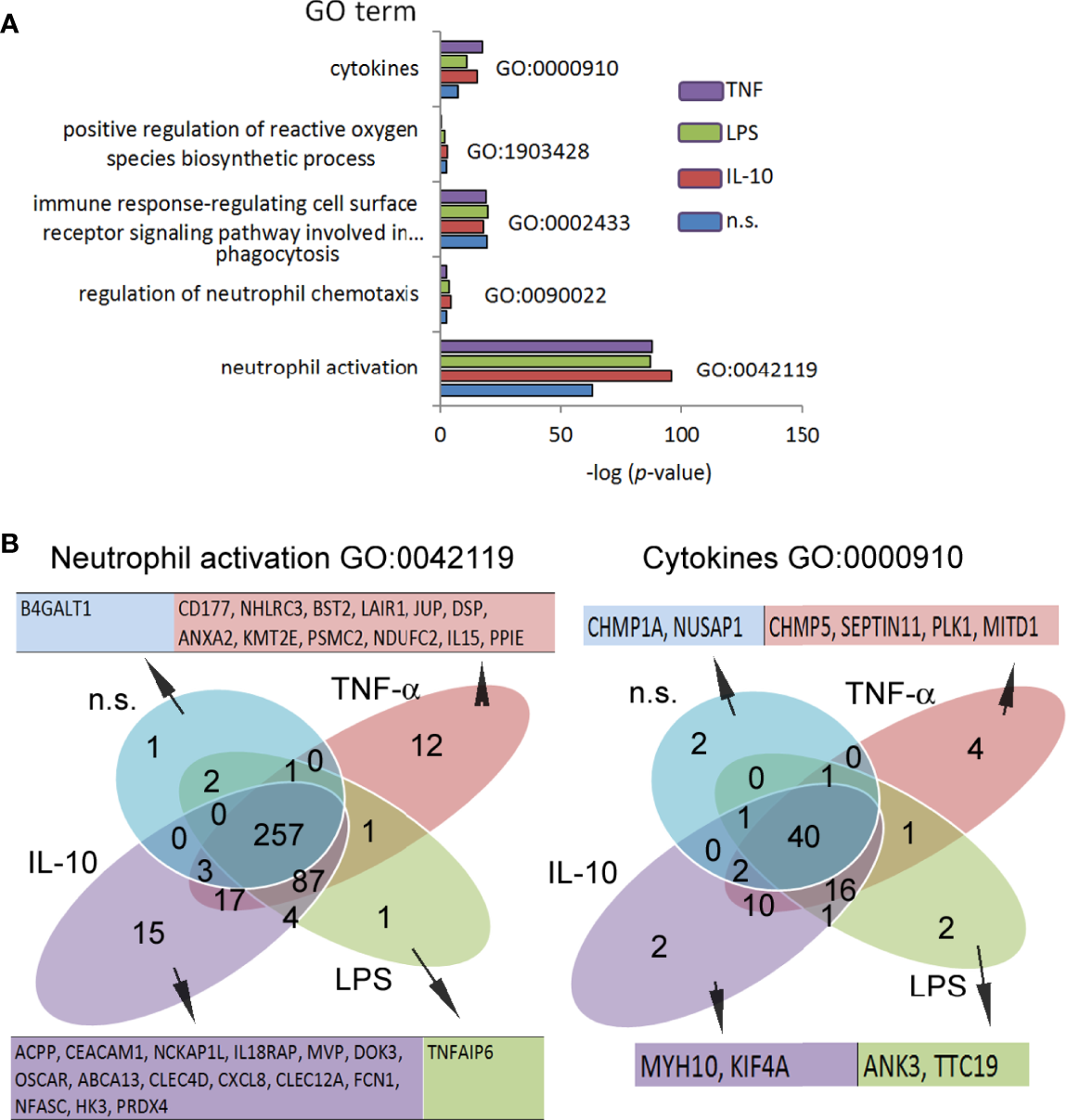 Figure 5 Neutrophils stimulated by IL-10, LPS, or TNF-α regulated H3K4me3-marked histone gene profile, determined different effects they exert during inflammation. (A) Gene Ontology analysis of the main processes responsible for neutrophil properties. Graph represents mean value calculated from four independent experiments. (B) Binding site overlap in the GO term ‘neutrophils activation’ and ‘cytokines’; n.s, non-stimulated.