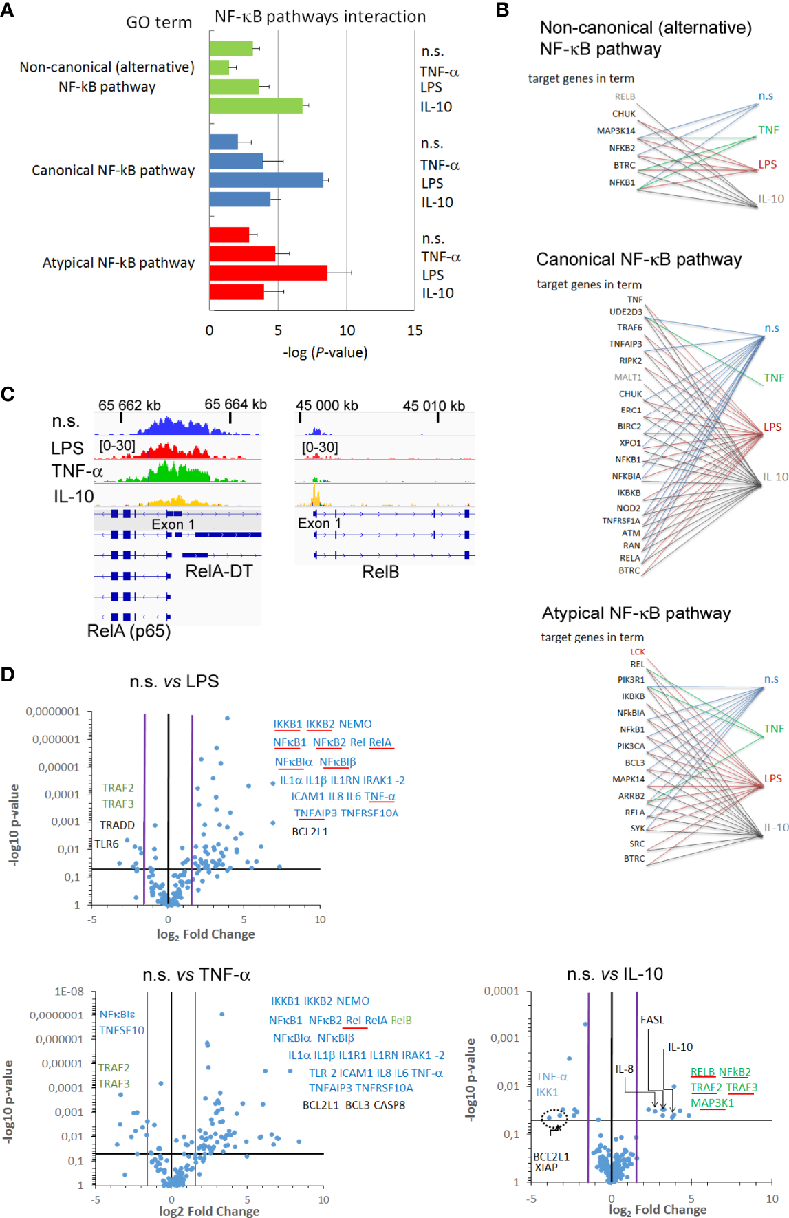 Figure 6 Changes within H3K4me3-marked histone in neutrophils stimulated by IL-10 affected target genes in non-canonical NF-κB pathway. (A) The analyses of GO terms: non-canonical, canonical, and atypical NF-κB pathways. The graph represents mean value ± SD calculated from four independent experiments. (B) The analysis of target genes in the GO terms NF-κB pathway within H3K4me3-marked histone. (C) The exemplary comparison of RelA, RelB, genes among different stimuli. (D) Different target genes proceeding in different stimuli directly reflected the profile of mRNA expression of pro- and anti-inflammatory factors. Volcano plot demonstrated statistical differences in value vs. relative fold changes to n.s. neutrophils. The blue horizontal line indicates the threshold for the p-value of the t-test (p<0.05); black vertical line indicates a fold-change in gene expression of 1; pink lines indicate the 3-fold-change in gene expression. Blue arrows indicate mRNA genes associated with canonical NF-κB pathway; green with non-canonical (alternative) and red atypical NF-κB pathway; circle dashed line bordered statistically significant pro-survival genes. Genes, in which mRNA expression corresponded with H3K4me3 GO analysis, are underlined with a red line; each point represents the mean calculated from four independent experiments; n.s, non-stimulated.