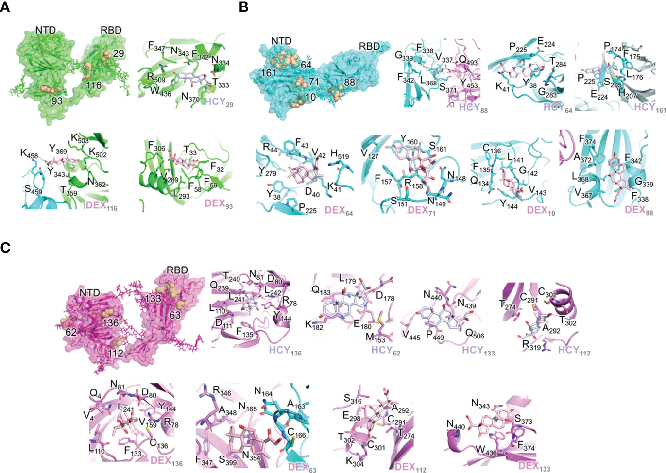 Figure 1 Interactions of the ligand/pocket pairs in chain A (green), chain B (cyan) and chain C (magenta) of the S1 protein. (A) The pockets on each chain A were ranked according to the binding affinity. The pockets where the ligands are predicted to bind with a higher affinity (>13 kcal/mol) after MD simulation are shown (Table 1). From left to right: High affinity binding pockets for cortisol and dexamethasone; Cortisol pocket 29; Dexamethasone pocket 116; Dexamethasone pocket 93. (B) The pockets on chain B were ranked according to the binding affinity. The pockets where the ligands are predicted to bind with a higher affinity (>13 kcal/mol) after MD simulation are shown (Table 3). From left to right: High affinity binding pockets for cortisol and dexamethasone; Cortisol pocket 88; Cortisol pocket 64; Cortisol pocket 161; Dexamethasone pocket 64; Dexamethasone pocket 71; Dexamethasone pocket 10. Dexamethasone pocket 88. (C) The pockets on chain C were ranked according to the binding affinity. The pockets where the ligands are predicted to bind with a higher affinity (>13 kcal/mol) after MD simulation are shown (Table 2). From left to right: High affinity binding pockets for cortisol and dexamethasone; Cortisol pocket 136; Cortisol pocket 62; Cortisol pocket 133; Cortisol pocket 112; Dexamethasone pocket 136; Dexamethasone pocket 63; Dexamethasone pocket 112; Dexamethasone pocket 133. The ligand and pocket ID have been shown in the bottom right-hand corner of each image.