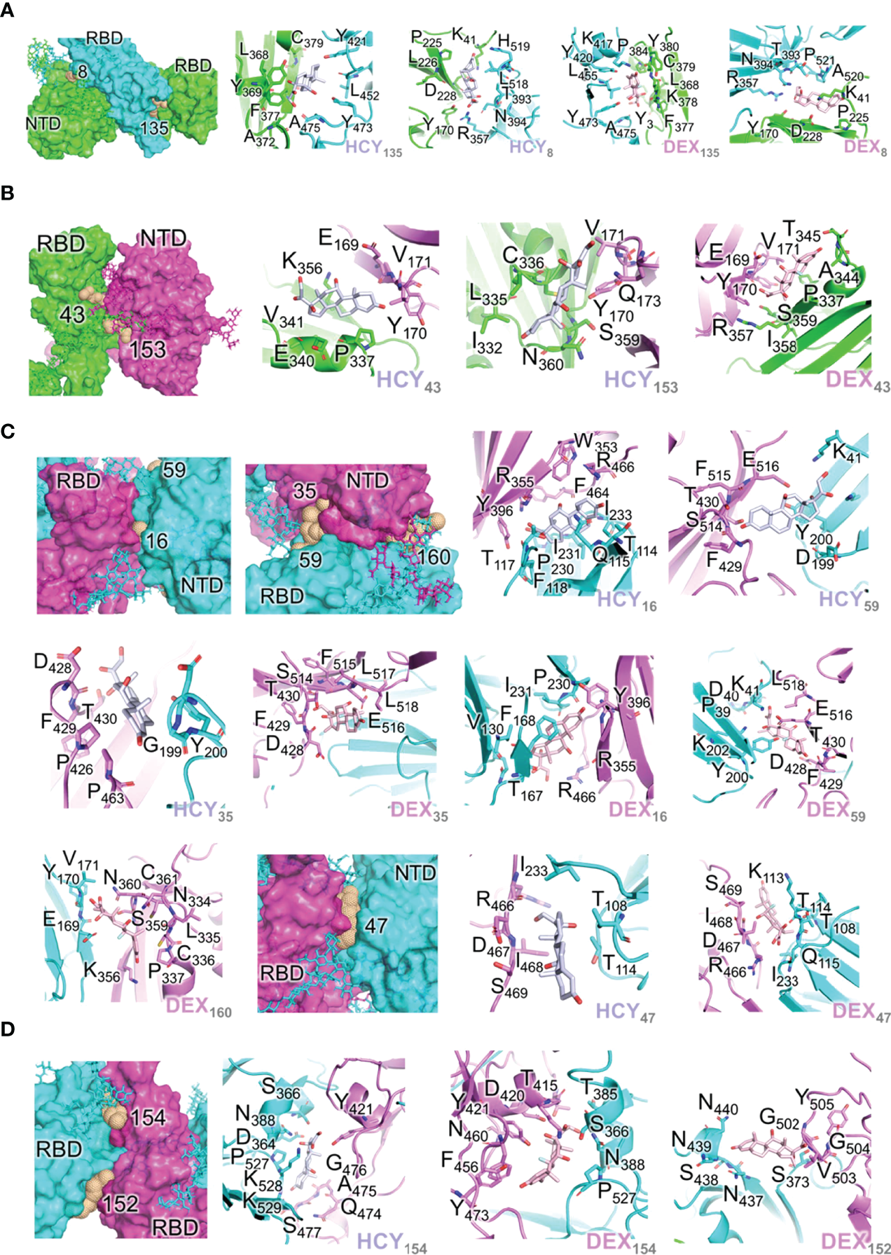 Figure 2 Interactions of the ligand/pocket pairs on the interfaces between chains A, B and C (A) Interactions of the ligand/pocket pairs on the interfaces between chain A (green) and chain B (cyan) of the S1 protein (Table 4). From left to right: High affinity binding pockets for cortisol and dexamethasone identified on the interface; Cortisol pocket 135; Cortisol pocket 8; Dexamethasone pocket 135; Dexamethasone pocket 8. (B) Interactions of the ligand/pocket pairs on the interfaces between chain A (green) and chain C (magenta) of the S1 protein (Table 4). From left to right: High affinity binding pockets for cortisol and dexamethasone identified on the interface; Cortisol pocket 43; Cortisol pocket 153; Dexamethasone pocket 43. (C) Interactions of the ligand/pocket pairs on the interfaces between chain B (cyan) and chain C (magenta) as shown in Table 4. From left to right: High affinity binding pockets for cortisol and dexamethasone identified on the interface; High affinity pockets identified between NTD of chain C and RBD of chain B; Cortisol pocket 16; Cortisol pocket 59; Cortisol pocket 35; Dexamethasone pocket 35; Dexamethasone pocket 16; Dexamethasone pocket 59; Dexamethasone pocket 160; High affinity pocket 47 identified between the interface of NTD of chain B and RBD of chain C; Cortisol pocket 47; Dexamethasone pocket 47. (D) Interactions of the ligand/pocket pairs on the interfaces between RBD of chain B (cyan) and RBD of chain C (magenta). The binding energies are shown in Table 4. The pockets where the ligands are predicted to bind with a higher affinity (>13 kcal/mole) after MD simulation are shown (Table 4). From left to right: High affinity binding pockets for cortisol and dexamethasone identified on the interface; Cortisol pocket 154; Dexamethasone pocket 154; Dexamethasone pocket 152.