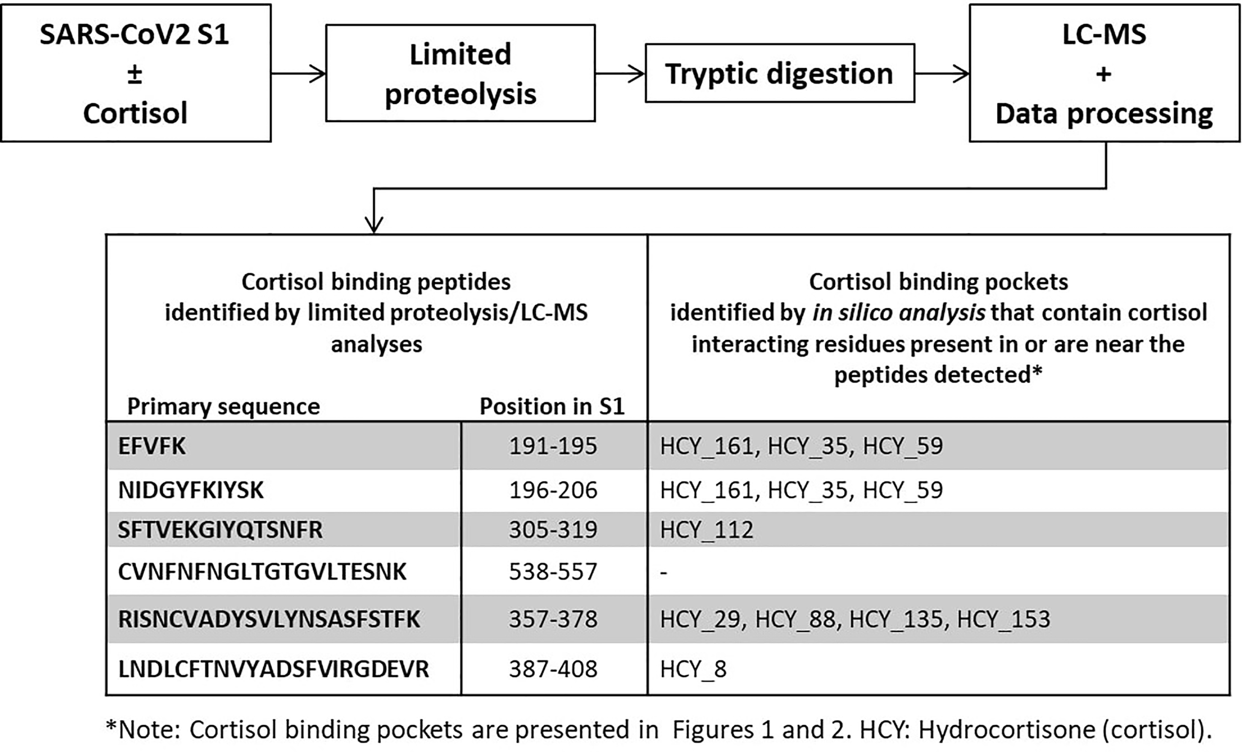 Using limited proteolysis and mass spectrometry (a method of identifying ligand-specific binding regions in a protein), we confirmed a number of cortisol binding pockets that we had identified in our molecular dynamics simulation studies (e.g., HCY_8, HCY_29, HCY35, HCY 59, HCY_88, HCY_112, HCY_153, HCY_161). Cortisol binds to residues that form these binding pockets or their neighbouring residues that can either protect the binding site from proteolytic cleavage (which results in the peptide being detected only in the presence of cortisol) or facilitate proteolytic cleavage (which results in the peptide being detected only in the absence of cortisol), depending on the perturbation/conformational change cortisol induces at a binding site. These results confirm the direct binding of cortisol to SARS-CoV-2 S1 in addition to pin-pointing multiple binding sites as previously identified by our in silico analyses.
