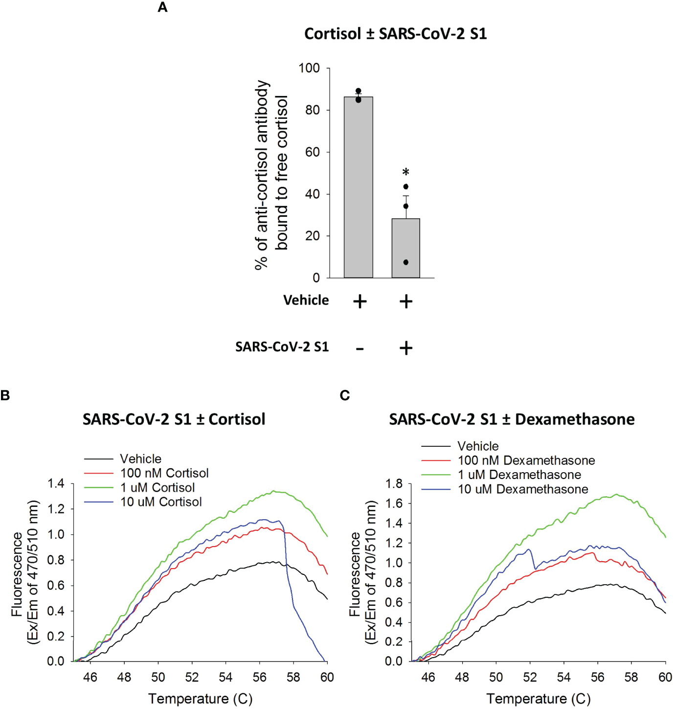 Figure 4 Cortisol directly binds SARS-CoV-2 S1 protein. (A) Bar graph showing a decrease in free cortisol in solution in the presence of SARS-CoV-2 S1. Cortisol was incubated with vehicle or SARS-CoV-2 S1 and the sample mixtures were filtered to collect unbound free cortisol in the flow through. The quantity of cortisol in the flow through from the samples was determined as the percentage of anti-cortisol antibody bound to cortisol as opposed to a competitor cortisol-acetylcholinesterase conjugate. Data presented as mean ± standard error (n = 3). *P < 0.05 vs vehicle (1-way ANOVA). (B, C) Line plots generated using GloMelt™ Thermal Shift Protein Stability assay showing unfolding (represented by increase in fluorescence) of SARS-CoV-2 S1 at increasing temperatures in the presence or absence of increasing concentrations of cortisol or dexamethasone (100 nM, 1 µM, 10 µM). Data for high concentrations (10 µM) of either cortisol or dexamethasone suggest formations of aggregates in the aqueous conditions of the assay (as indicated by the decay of the signal). Data are representative of two independent experiments.