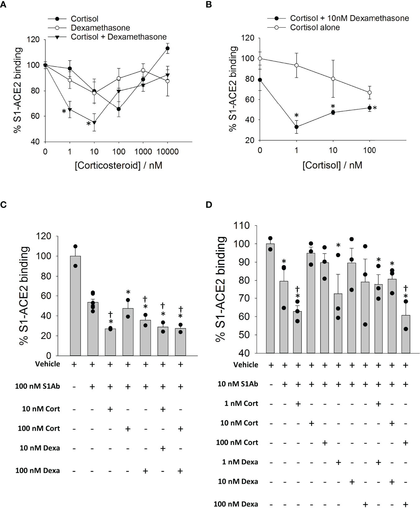 Figure 5 The effects of cortisol and dexamethasone on the binding of SARS-CoV-2 S1 to ACE2. (A) Plot showing a dose response on SARS-CoV-2 S1-ACE2 interaction in the presence of increasing concentration of glucocorticoids (cortisol, dexamethasone or a mixture of cortisol and dexamethasone). Each data plot was normalized to vehicle (100% S1-ACE2 binding). Data presented as mean ± standard error (n = 2-6). *P < 0.05 vs cortisol or dexamethasone alone at same concentration (1-way ANOVA). (B) Plot showing a dose response on SARS-CoV-2 S1-ACE2 interaction in the presence of increasing concentration of cortisol ± 10 nM dexamethasone. Each data plot was normalized to vehicle (100% S1-ACE2 binding). Each data plot was normalized to vehicle (100% S1-ACE2 binding). Data were measured in at least two independent replicates and are presented as mean ± standard error. *P < 0.05 vs cortisol alone at same concentration (1-way ANOVA). (C, D) Bar plot showing the effect of cortisol or dexamethasone on the inhibition of SARS-CoV-2 S1-ACE2 interaction by anti-SARS-CoV-2 S1 antibody (10nM or 100nM). Data are normalized to vehicle (100% S1-ACE2 binding). Data presented as mean ± standard error (n = 2-6). *P < 0.05 vs vehicle (1-way ANOVA); †P < 0.05 vs S1Ab alone (1-way ANOVA).