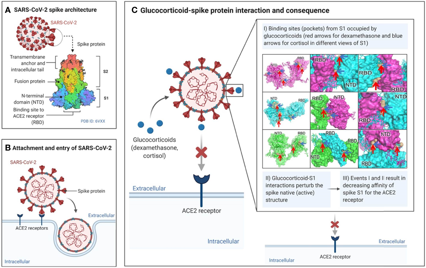 We hypothesized that non-antibody classes of biomolecules that bind spike at one or many sites can perturb the conformation of the RBD and, consequently, reduce the RBD affinity for ACE2. We tested our hypothesis for glucocorticoids owing to the huge physiological and clinical significance of this class of biomolecules and their synthetic analogues. In humans, the adrenal cortex produces more than 50 different glucocorticoid hormones which are subdivided into glucocorticoids (such as cortisol) and mineralocorticoids (such as aldosterone) (13). A number of synthetic glucocorticoids such as dexamethasone, prednisone and prednisolone have been applied for their anti-inflammatory or immune-suppressive actions (13, 14) in syndromes closely related to COVID-19, including SARS, MERS, severe influenza, and community-acquired pneumonia with various efficacies (15, 16). The United Kingdom-based Randomized Evaluation of COVID-19 Therapy trial found that dexamethasone 6 mg/d for 10 days results in reduction in 28-day mortality in patients receiving invasive mechanical ventilation at the time of randomization (17). Similar beneficial effects have been reported for various formulations of dexamethasone, hydrocortisone (cortisol), and methylprednisolone in reduction of mortality in COVID-19 patients requiring supplemental oxygen (15, 17, 18). However, the mechanisms underlying the beneficial effects of glucocorticoids in reduction of mortality in COVID-19 patients are unclear. Lack of knowledge on the specific mechanisms of action of glucocorticoids in the settings of SARS-CoV-2 infection prevents improving their efficacy and expanding their application to a broad spectrum of SARS-CoV-2 infected patients.