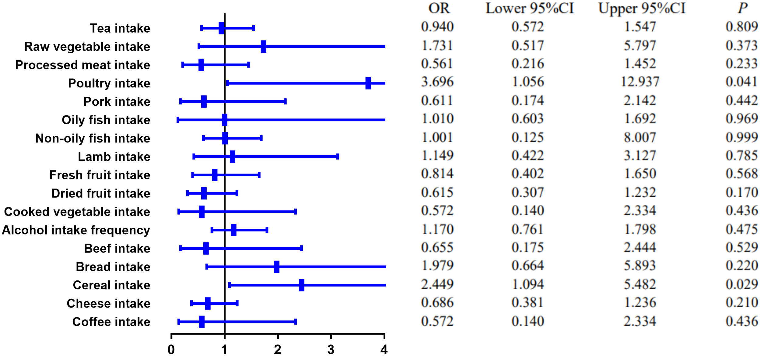 MR estimates of different methods are presented in Tables 3, 4. In the primary IVW MR analysis, two causal associations from 17 food intakes to CD were identified, while only one causal association was observed for UC. As shown in Figures 2, 3, We found evidence that increased consumption of poultry was associated with a higher risk of CD (OR, 3.696; 95% CI, 1.056–12.937; p = 0.041) but was not associated with UC (OR, 0.633; 95% CI, 0.114–3.505; p = 0.600). Higher cereal intake level also increased CD risk (OR, 2.449; 95% CI, 1.094–5.482; p = 0.029). On the contrary, genetically predicted oily fish intake level was statistically significantly associated with the risk of UC (OR, 1.482; 95% CI, 1.002–2.194; p = 0.049) but not with CD (OR, 1.010; 95% CI, 0.603–1.692; p = 0.969). In addition to the above causal associations identified by the IVW test, several intriguing results were identified by other MR tests, including cheese intake based on maximum likelihood method (OR, 0.671; 95% CI, 0.474–0.950; p = 0.024) and processed meat intake based on the weighted median method (OR, 0.360; 95% CI, 0.136–0.952; p = 0.040), both of which were suggested to be associated with a decreased risk of CD (Table 3). Conversely, bread intake based on the weighted median method (OR, 0.332; 95% CI, 0.146–0.752; p = 0.008) and dried fruit intake based on the MR Egger method (OR, 0.029; 95% CI, 0.001–0.603; p = 0.030) were suggested to be associated with a decreased UC risk (Table 4).