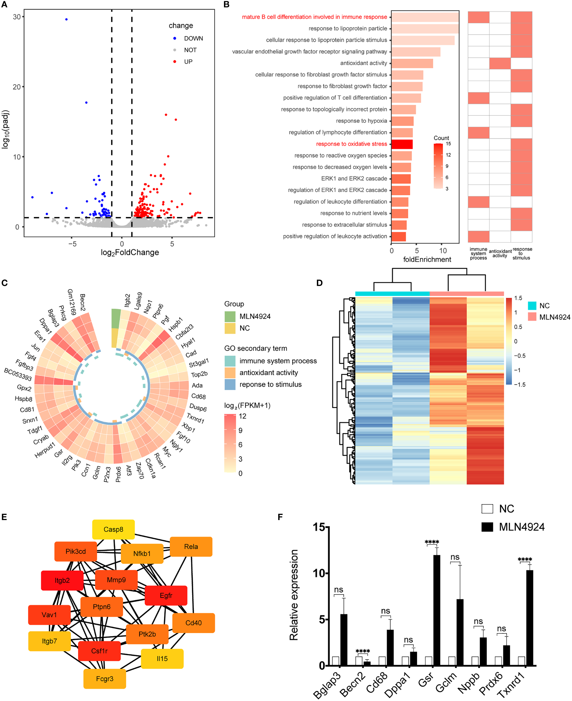 To support the results of GO analysis, GSEA analysis was performed using all 13,078 expressed genes, and 196 genes in seven enrichment terms (Figure S1C) related to immunity, cytokines, and stimulus were selected for the heatmap. The expression of these genes demonstrated an upregulation trend in the MLN4924 treatment group (Figure 2D) and Itgb2, Cd81, Hyal1, Gpx2, Cd68, Ada, Lgals9, Pgf, Hspb1, and Ptpn6 were found in GO and GSEA results. Protein-protein interaction was performed and hub genes were identified by CytoHubba, including p65 (also known as Rela) and NF-κB (Figure 2E). The differentially expressed genes were validated by qPCR, as shown in Figure 2F, indicating an overall elevation of oxidative stress.