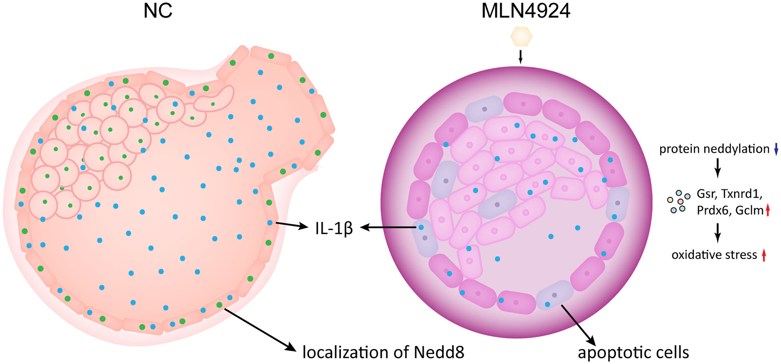 In summary, we propose the hypothesis that neddylation inhibition causes the interference of protein degradation and turnover, after which oxidative stress levels increase in the blastocyst. Dysfunction in biological processes led to putatively detrimental effects contributing to the insufficient hydrostatic pressure in the blastocyst cavity. The secreted proinflammatory cytokine IL-1β was reduced in the MLN4924-treated blastocysts in an NF-κB-independent manner and caused the impairment of embryo quality and finally blastocyst hatching failure. The limitation of our current study is the lack of more direct Nedd8 downstream regulation which will be deeply discovered in our further investigation. The low material amount in embryo samples makes it difficult to perform multiomics study at the protein or metabolite level, for example the conventional mass spectrometry. Considering the nature of neddylation as a post-translational modification, novel research strategies and state-of-the-art technologies would be employed.