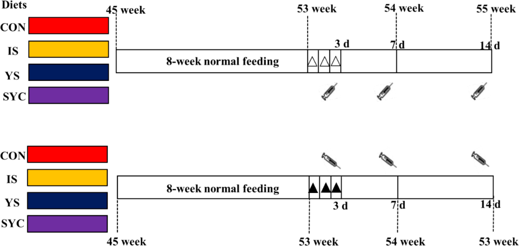 During the 8-week normal feeding period, no differences of laying performance were observed among the different treatment groups (P > 0.05) (Table 1). As shown in Table 2, the egg production rate and egg mass at 0−3 and 4−7 days were reduced markedly, and the feed-to-egg ratio at 4−7 days was increased after the S. Enteritidis challenge (P < 0.05). In addition, compared to IS, SYC supplementation significantly increased the egg production rate from 8 to 14 days after the S. Enteritidis challenge (P < 0.05). There were no differences in the mean weight of eggs and average feed intake of laying hens during 0−3, 4−7, and 8−14 days among different treatment groups (P > 0.05).
