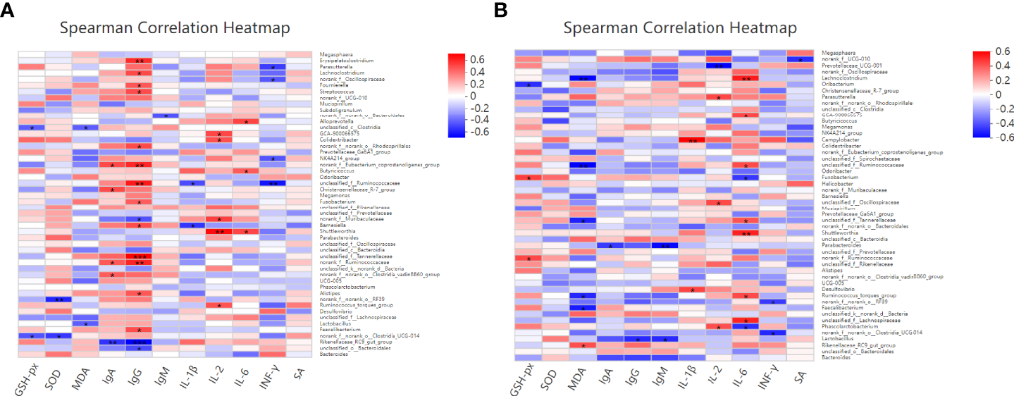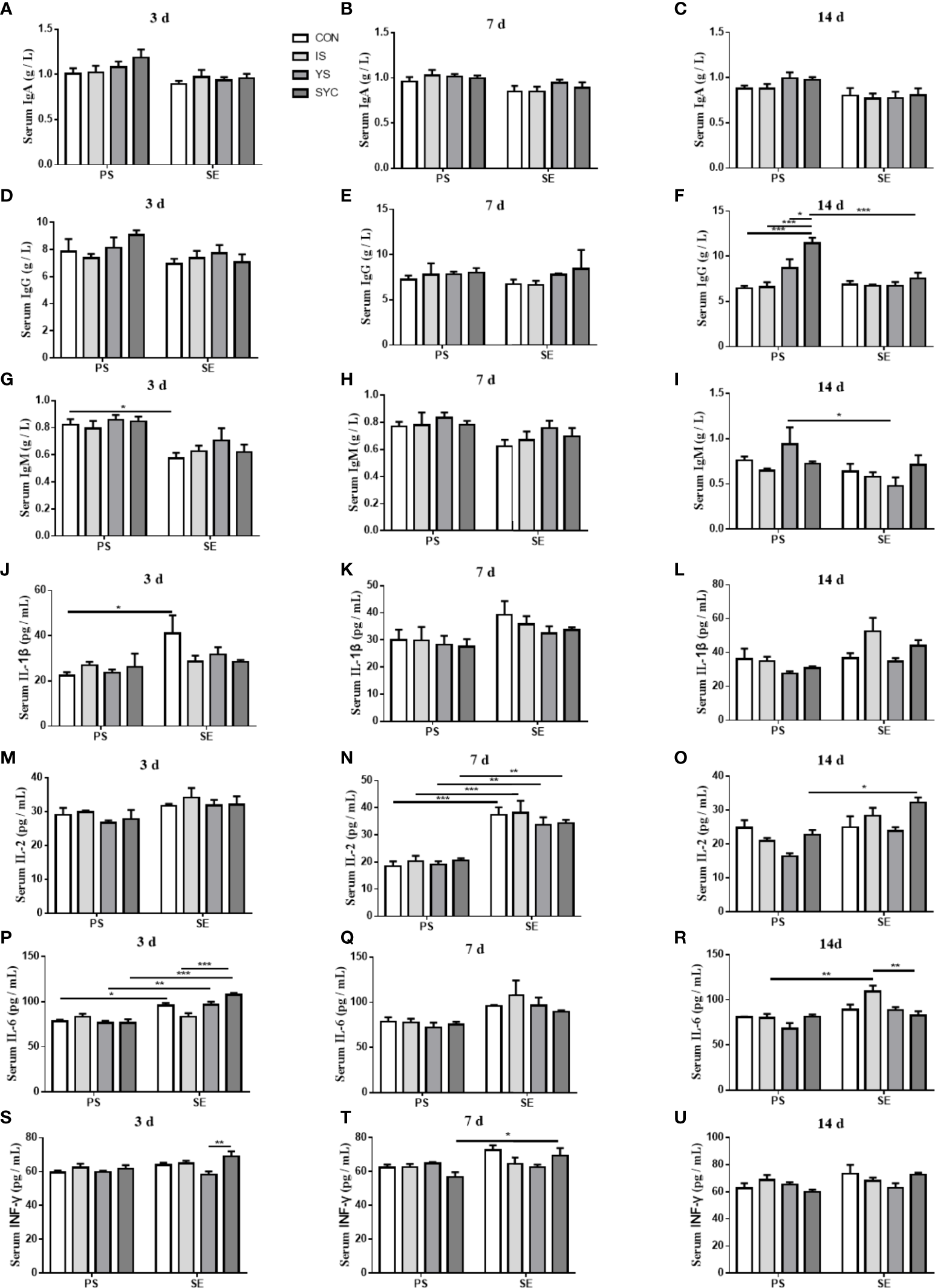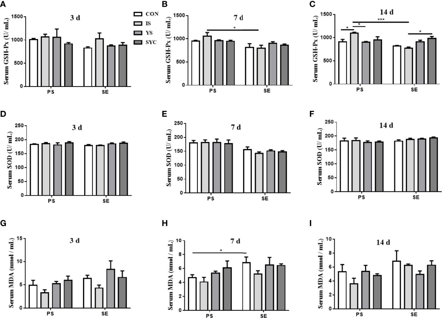 At the end of 3, 7, and 14 days after the S. Enteritidis challenge, blood samples of five chicken hens in each replicate were collected into heparin treated tubes for 3 h and then centrifuged at 3,000 revolutions per minute for 20 min to get the sera, which were stored at -20°C for further analysis. All samples of five chickens in each replicate were mixed in equal proportions into one sample before analysis (24). The S. Enteritidis -specific antibody titer of the serum was determined by using avian Salmonella ELISA antibody test kit (catalog number SALS-5P, Biovetest Biotechnology Co., Ltd., Tianjin, China), following the instructions provided by the manufacturer. Serum MDA (catalog number A003-1-2), superoxide dismutase (SOD, catalog number A001-3-2), glutathione peroxidase (GSH-Px, catalog number A005-1-2), immunoglobulin A (IgA, catalog number H108-1-2), immunoglobulin G (IgG, catalog number H106), immunoglobulin M (IgM, catalog number H109), interleukin-1β (IL-1β, catalog number H002), interleukin-2 (IL-2, catalog number H003), interleukin-6 (IL-6, catalog number H007-1-2), and interferon-γ (IFN-γ, catalog number H025) were measured by using corresponding kits (Nanjing Jiancheng Biology Engineering Institute, Nanjing, China) according to instructions.