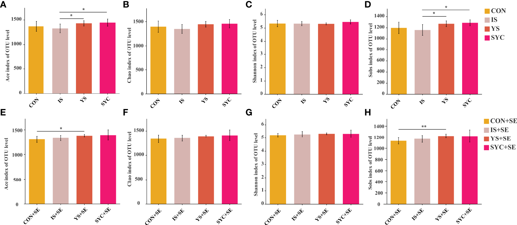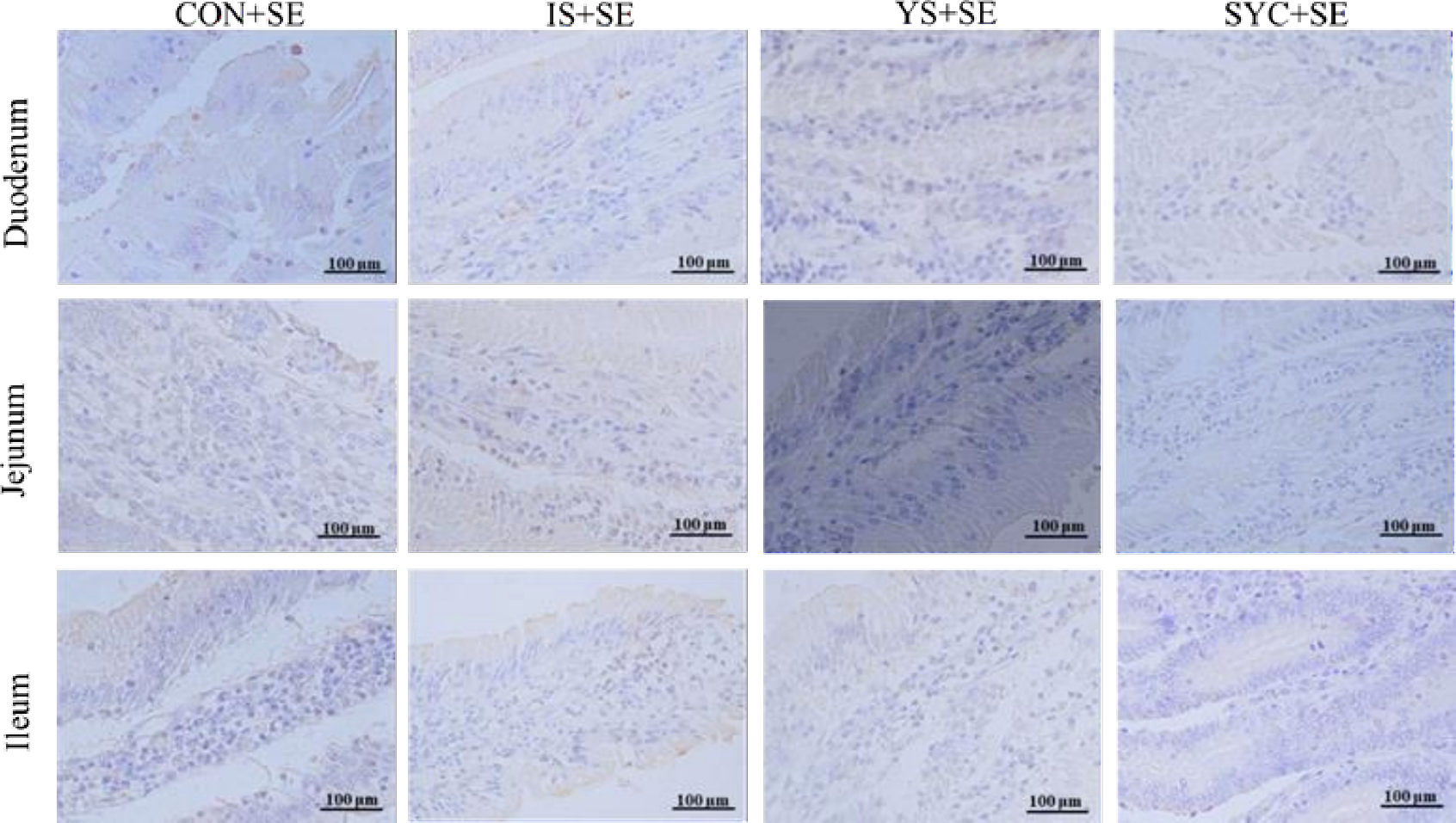 CON, basal diet; IS, sodium selenite; YS, yeast selenium; SYC, selenium-enriched yeast culture; SE, Salmonella Enteritidis; –, with physiological saline solution challenge; +, with SE challenge.