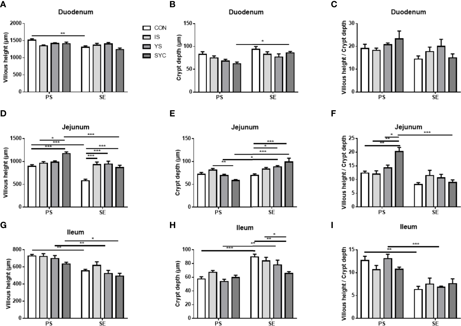 At 14 days after S. Enteritidis challenge, the duodenum, jejunum, and ileum of chicken were collected and fixed in 4% paraformaldehyde for 24 h. The method of histological examination referred to that in Li et al. (25). Images were collected by using the CaseViewer 2.4 software (3DHISTECH Ltd., Budapest, Hungary). The villus height and crypt depth were determined by ImageJ software.