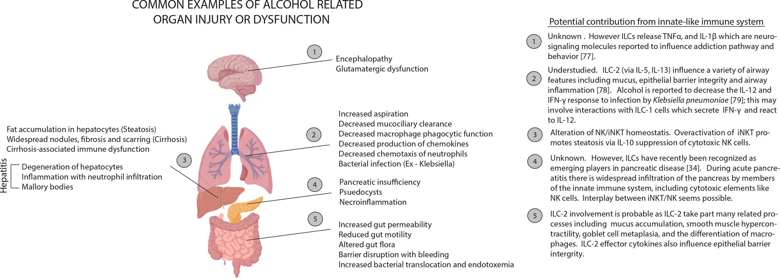 Examples of alcohol related organ injury with potential influences from the innate-like immune system. Many tissues rely on processes regulated by innate-like immune signaling to maintain homeostasis. Alcohol can perturb homeostasis by interfering with signal release (ex. decrease in IL-22 release by ILC-3 cells), by depleting or activating regulatory cells (ex. maturation of iNKT and inactivation of NK cells following alcohol exposure) or by interfering with effector cell function. Little has been rigorously established about how broad changes in the innate-like immune system result in tissue damage. However, we can make some informed inferences. Depletion of signals like IL-22 could facilitate injury in tissues like the lungs and small intestines (2, 5) because IL-22 is a fundamental mediator of inflammation, mucous production and tissue regeneration. During necrotic alcohol-associated tissue injuries (3, 4), there is often tissue infiltration by cytolytic elements including NK cells. In a healthy individual, the activity of these cytotoxic elements is kept in check by cytokine signaling by innate-like including iNKT cells. However, alcohol exposure can dysregulate this signaling and periods of hypo- and hyperactive cytolytic activity may result.