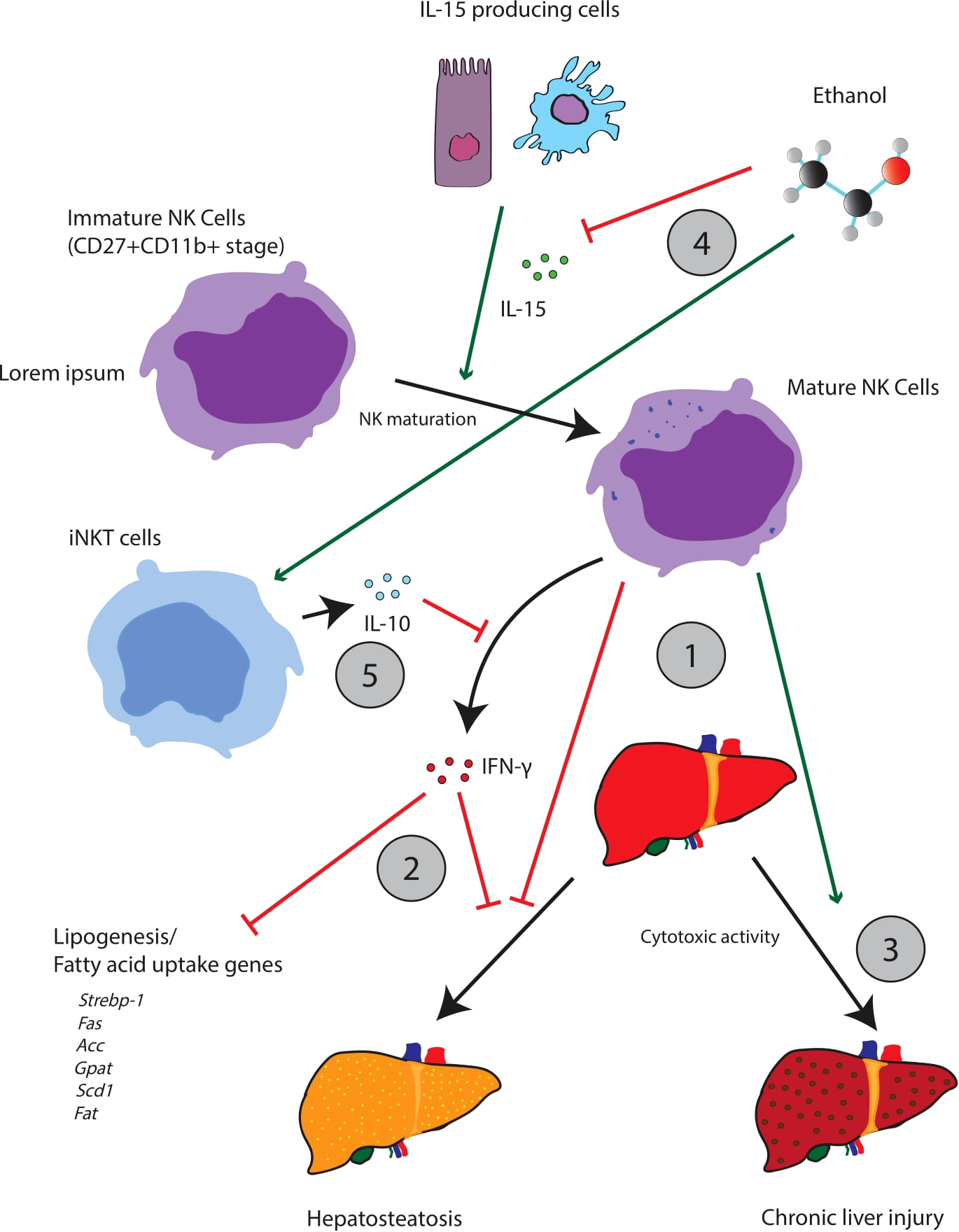 In summary, alcohol arrests the development of NK cells in CD27+CD11b+ which could contribute to systemic dysregulation via interference with NK-driven IFN-γ signaling. Such dysregulation can contribute to the development of alcoholic liver disease, and studies on the depletion of cNK cells (via the anti-AsGM1 antibody) show increased steatohepatitis. Interestingly, NK-cell maturation can be rescued by the administration of IL-15 which suggests that IL-15 signaling is disrupted following alcohol administration. However, we have not rigorously identified which specific IL-15 producers are involved.