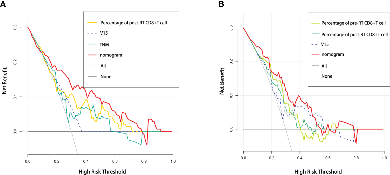Multivariate analysis suggested that TNM stage, post-RT percentage of CD8+ T cell, and lung V15 were independent predictive factors of RP. Besides, pre- and post-RT percentage of CD8+ T cell, and V15 were independent factors of ≥ grade 2 RP. The C-indexes of RP and ≥ grade 2 RP nomograms were 0.809 (95% CI: 0.715-0.903) and 0.787 (95% CI: 0.685-0.889) in the training cohort, respectively. And the C-indexes of RP and ≥ grade 2 RP nomograms were 0.718 (95% CI: 0.544-0.892) and 0.621 (95% CI: 0.404-0.837) in the validation cohort, respectively. The calibration curves showed that the predicted values of model agreed well with actual observations. Moreover, DCA results indicated the applicability and accuracy of the models to predict RP and ≥ grade 2 RP. After stratification, the incidence of the high-risk group was significantly higher than that of the low-risk group with respect to either RP or ≥ grade 2 RP.