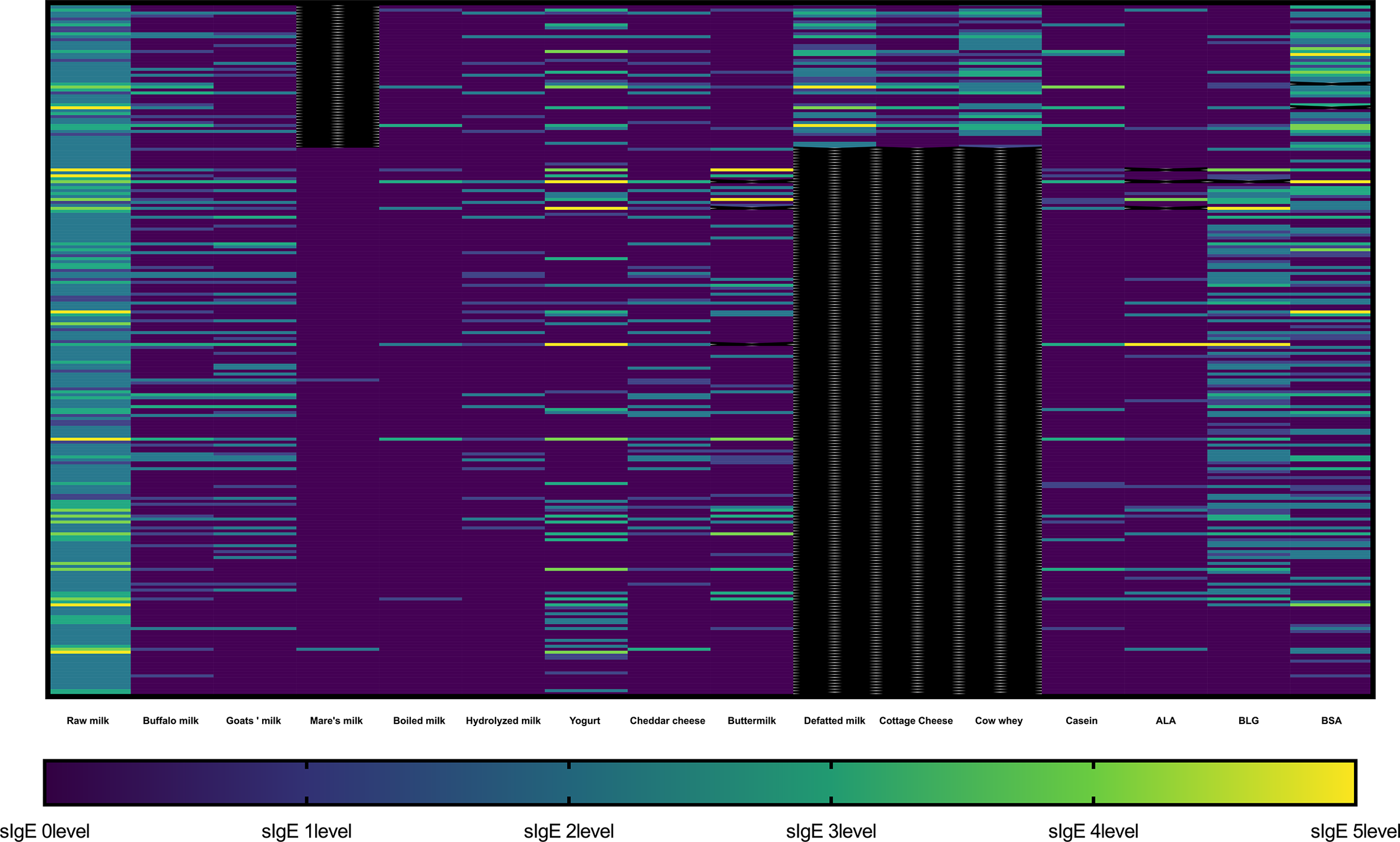 Heatmap representing sIgE levels against different milk-related product in each participant. The sIgE result was divided into 6 levels: level 0 (< 0.35 kU/L), level 1 (≥ 0.35 kU/L and < 0.7 kU/L), level 2 (≥ 0.7 kU/L and < 3.5 kU/L), level 3 (≥ 3.5 kU/L and < 17.5 kU/L), level 4 (≥ 17.5 kU/L and < 50 kU/L), level 5 (≥ 50 kU/L and < 100 kU/L), and level 6 (≥ 100 kU/L). The black color represents missing data. ALA, α-lactalbumin; BLG, β-lactoglobulin (BLG); BSA, bovine serum albumin (BSA).