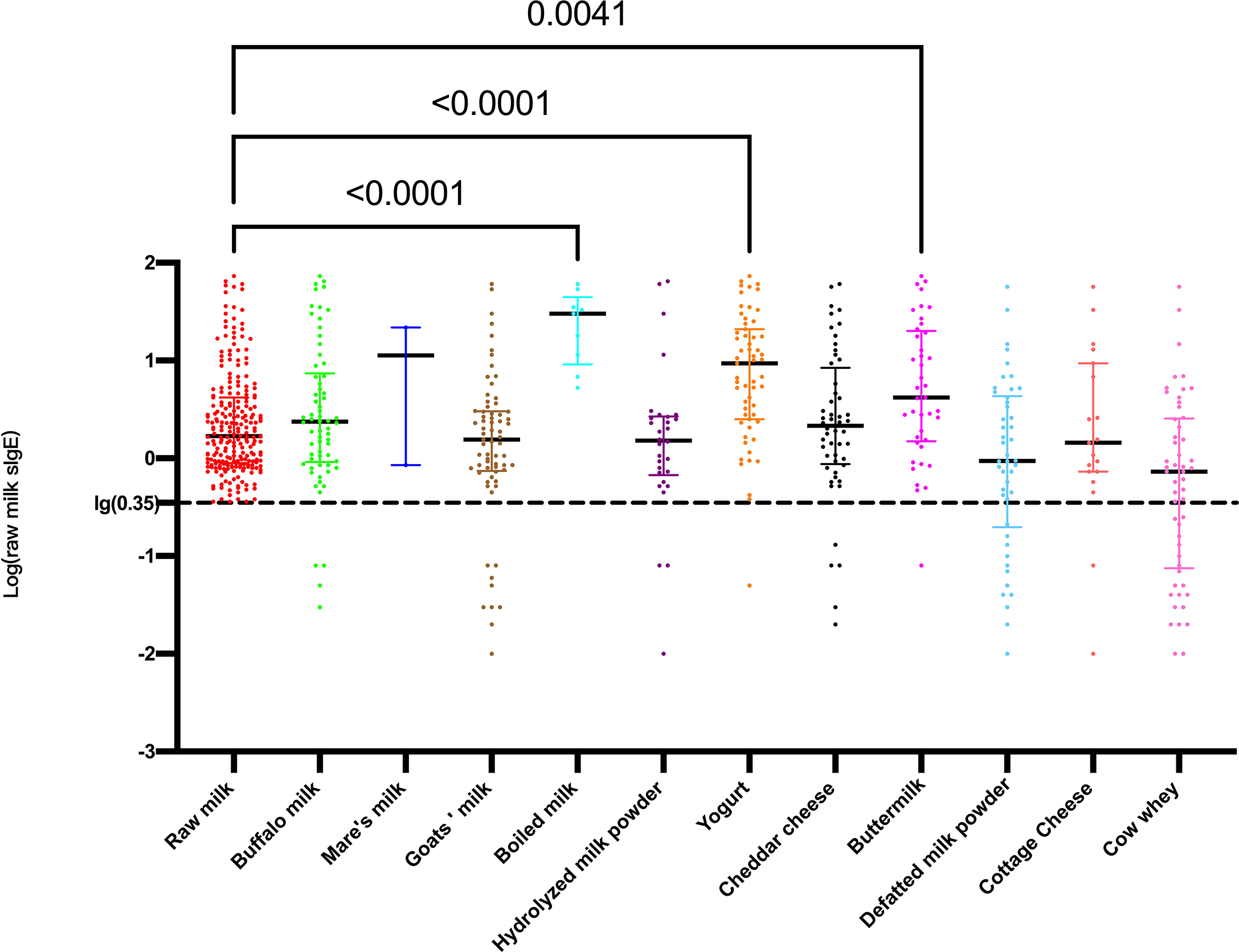 Levels of log-transformed sIgE against raw milk among different dairy product sIgE-positive participants.