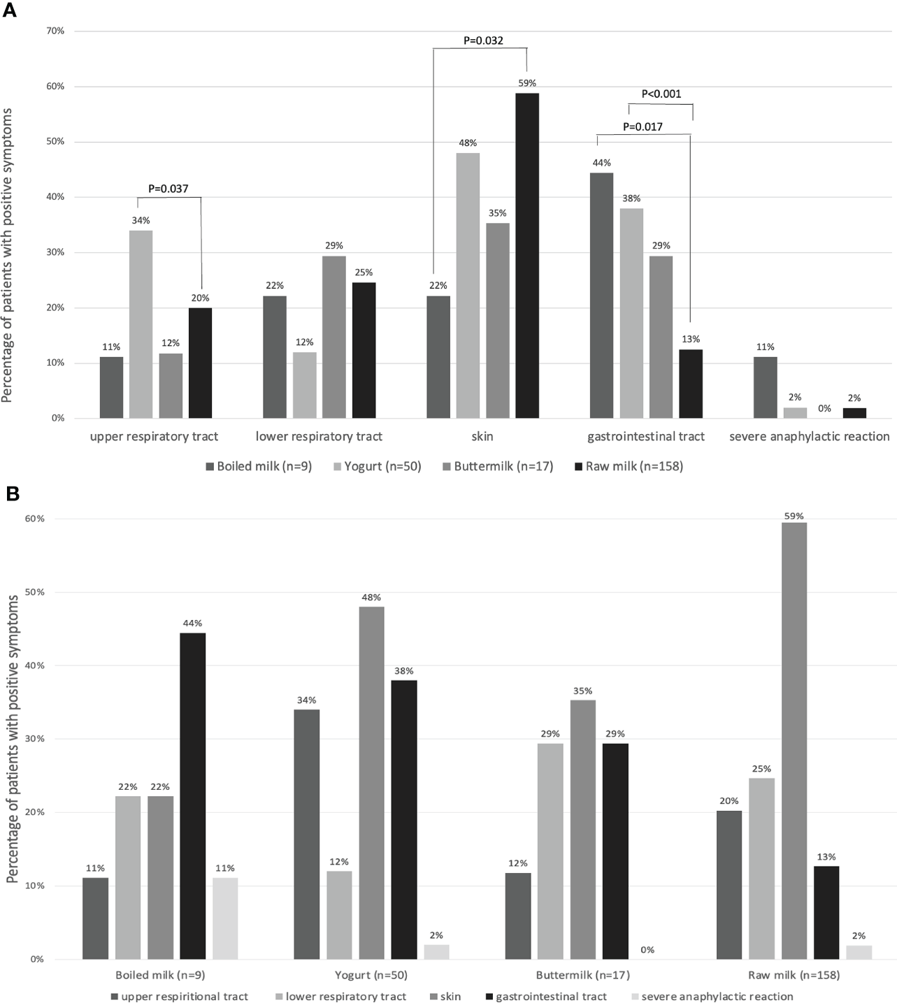 (A) The percentages of patients with allergic symptoms in four groups: boiled milk (n = 9), yogurt (n = 50), buttermilk (n = 17), and raw milk (n = 158), reported as groups by affected body systems. (B) The percentages of patients with allergic symptoms, reported as four groups.