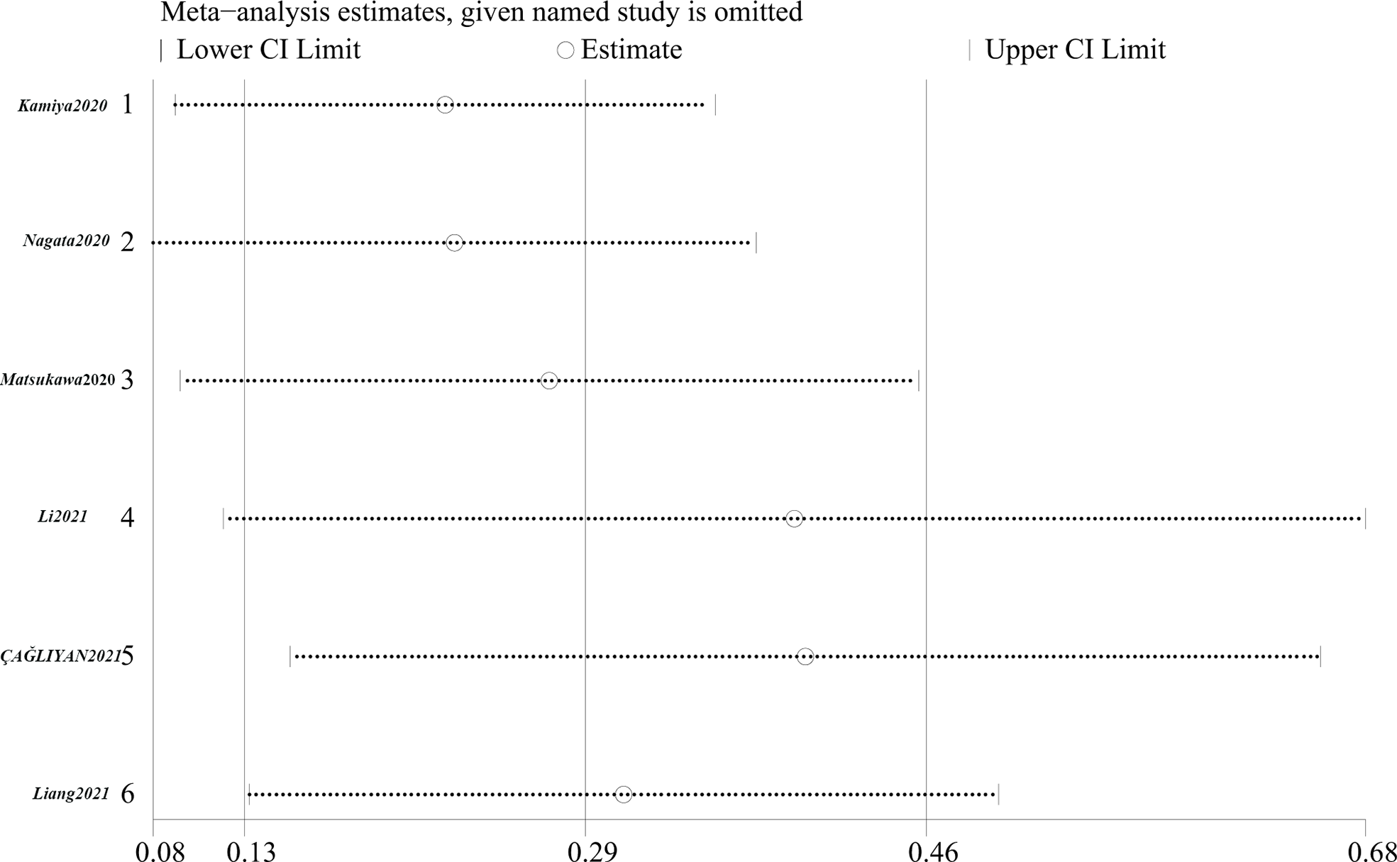 The results of the sensitivity analysis are shown in Figure 3. The pooled lnHR was 0.29 (95% CI 0.13-0.46). After the arbitrary deletion of one study, the pooled lnHRs of the remaining studies ranged from 0.23 to 0.40. Thus, the arbitrary deletion of one piece of literature from this meta-analysis did not affect the results, implying that the above conclusions of the random effects model are stable and reliable.