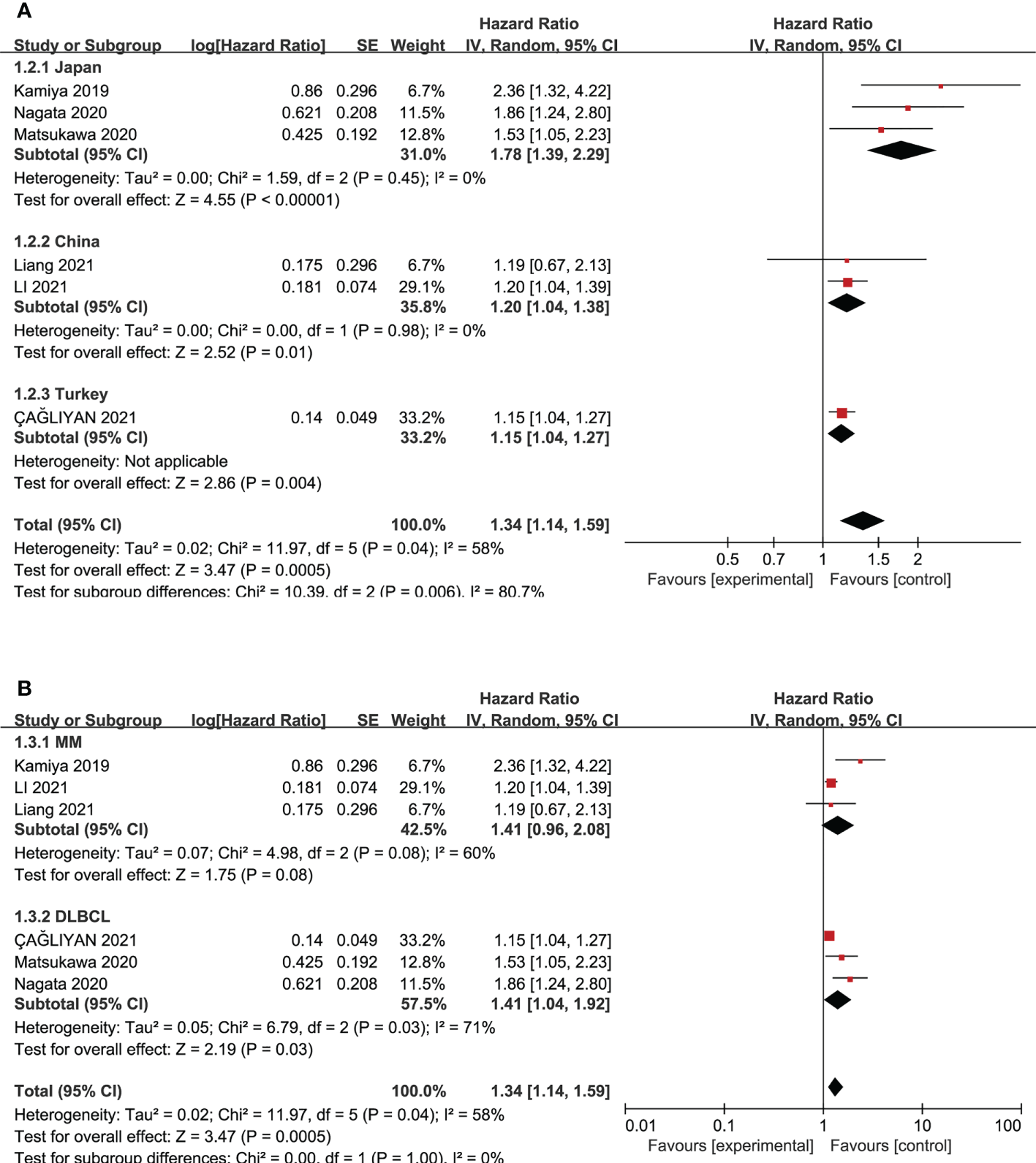 Stratification by disease type showed that the HR was 1.41 (95% CI 0.96-2.08, I²=60%, P=0.08) for MM and 1.41 (95% CI 1.04-1.92, I2 = 71%, P=0.03) for DLBCL. Stratification by patients’ nationality indicated that the HR was 1.78 (95% CI 1.39-2.29, I2 = 0%, P=0.45), 1.20 (95% CI 1.04-1.38, I2 = 0%, P=0.98), and 1.15 (95% CI 1.04-1.27) for Japan, China, and Turkey, respectively. The results of subgroup analysis are shown in Figure 4. From the results, it can be concluded that the heterogeneity of the meta-analysis may originate from patient race and is not related to the disease type.