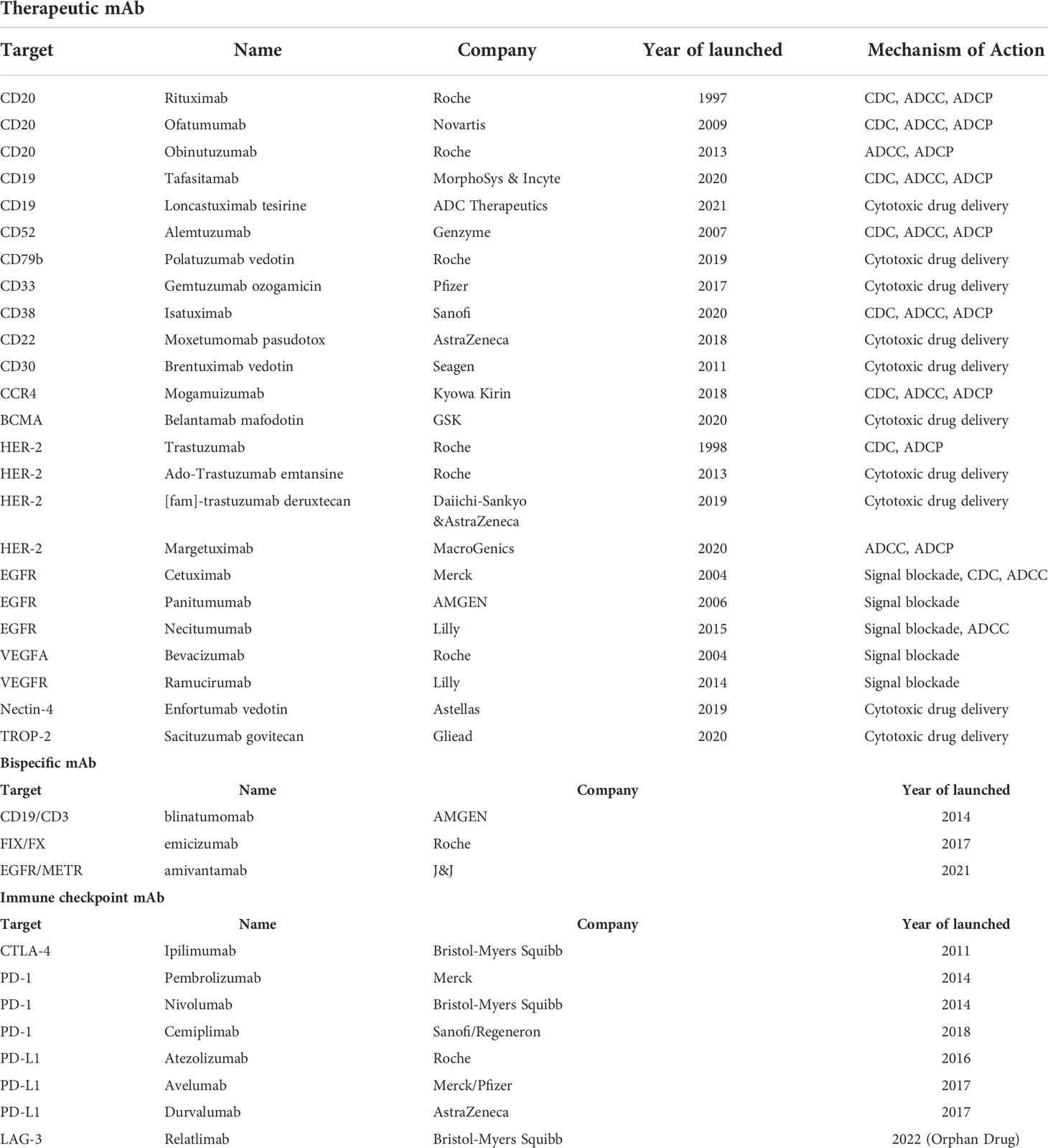 mAbs are immunoglobulins (Ig) which commonly include two Fab terminals binding to targets and an Fc terminal binding to receptors on the surface of immune cells. All mAbs exert their function by direct targeting via Fab terminals. Additionally, Fc-Fc receptor (FcR) interaction can modulate their modes of action (MOA) (6, 7). The main Fc-mediated effector functions are classified into complement-dependent cytotoxicity (CDC), antibody-dependent cell-mediated cytotoxicity (ADCC), and antibody-dependent cellular phagocytosis (ADCP). CDC is attributed to the Fc interaction with complement component C1q, followed by the activation of the complement system leading to the downstream immune responses on different immune cells (8, 9). ADCC and ADCP are two mechanisms mediated by the direct interaction of Fc and FcγR. ADCC is mainly attributed to NK cells activated by the interaction of FcγRIIIa with the mAb’s Fc part. ADCP is mediated by FcγIIa-activated macrophages, which can phagocytose antibody-bounded tumor cells, leading to the elimination of tumor cells (8, 9). In other MOAs, mAbs are used to bind and block, such as soluble antigens (e.g., α- tumor necrosis factor (TNF-α)) and disease-dependent pathological mediators (e.g., vascular endothelial growth factor (VEGF)). Since rituximab targeting CD20 was first approved for Non-Hodgkin’s lymphoma (NHL) in 1997, the US Food and Drug Administration (FDA) has approved a variety of therapeutic monoclonal antibodies, which can target CD19, HER-2, VEGFA, EGFR, and CD52, etc. (Table 1).