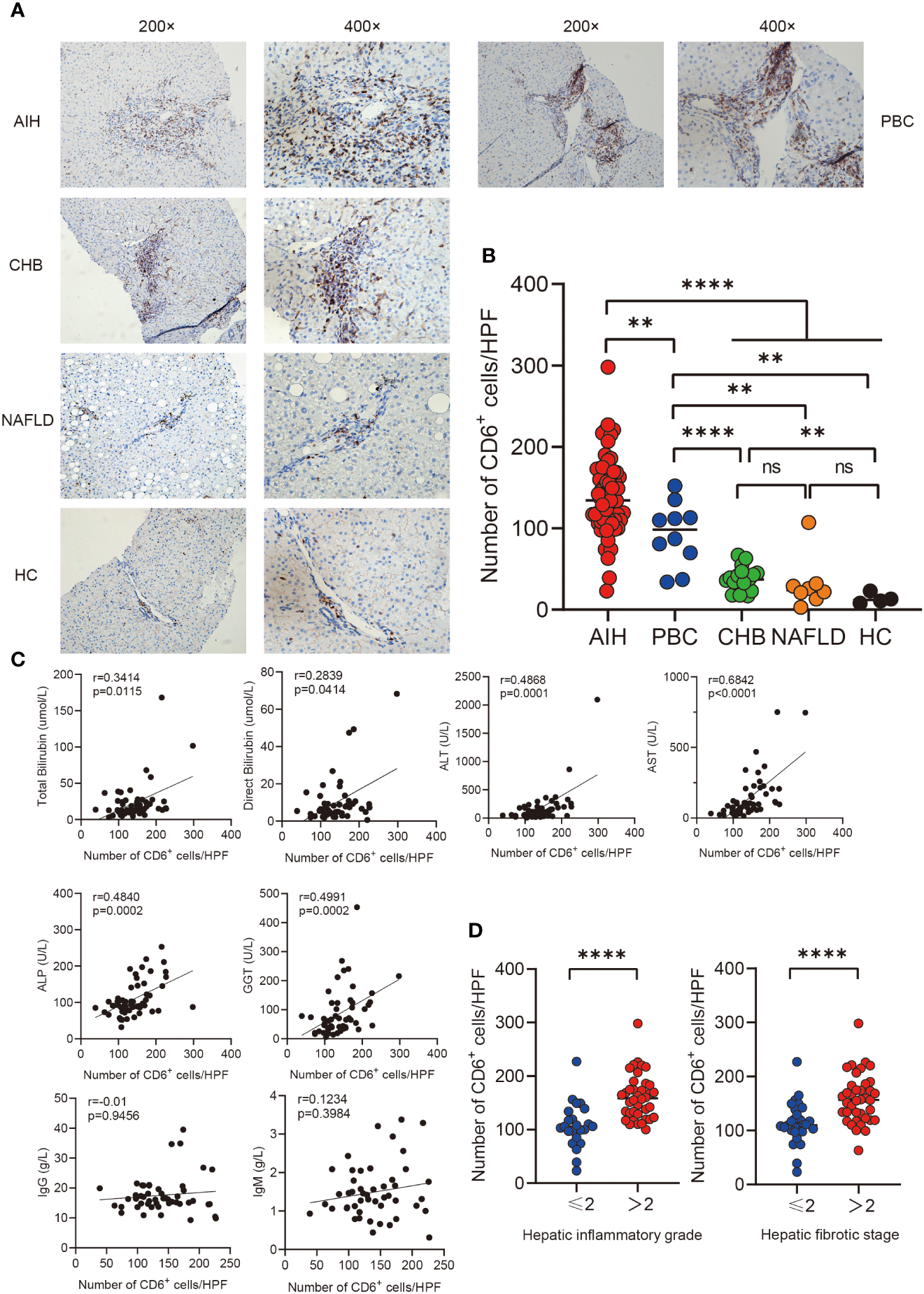 Immunohistochemistry analysis of CD6 expression in liver. (A, B) Representative immunohistochemistry images and quantification of CD6 positive cells in liver biopsies from AIH (n=61), PBC (n=10), CHB (n=17), NAFLD (n=8) and HC (n=4). (C) Correlations between the number of CD6 positive cells and clinical features of patients with AIH (n=61). (D) The number of CD6 positive cells was compared between different inflammatory grades and fibrosis stages. **p < 0.01, ****p < 0.0001, ns: not significant.