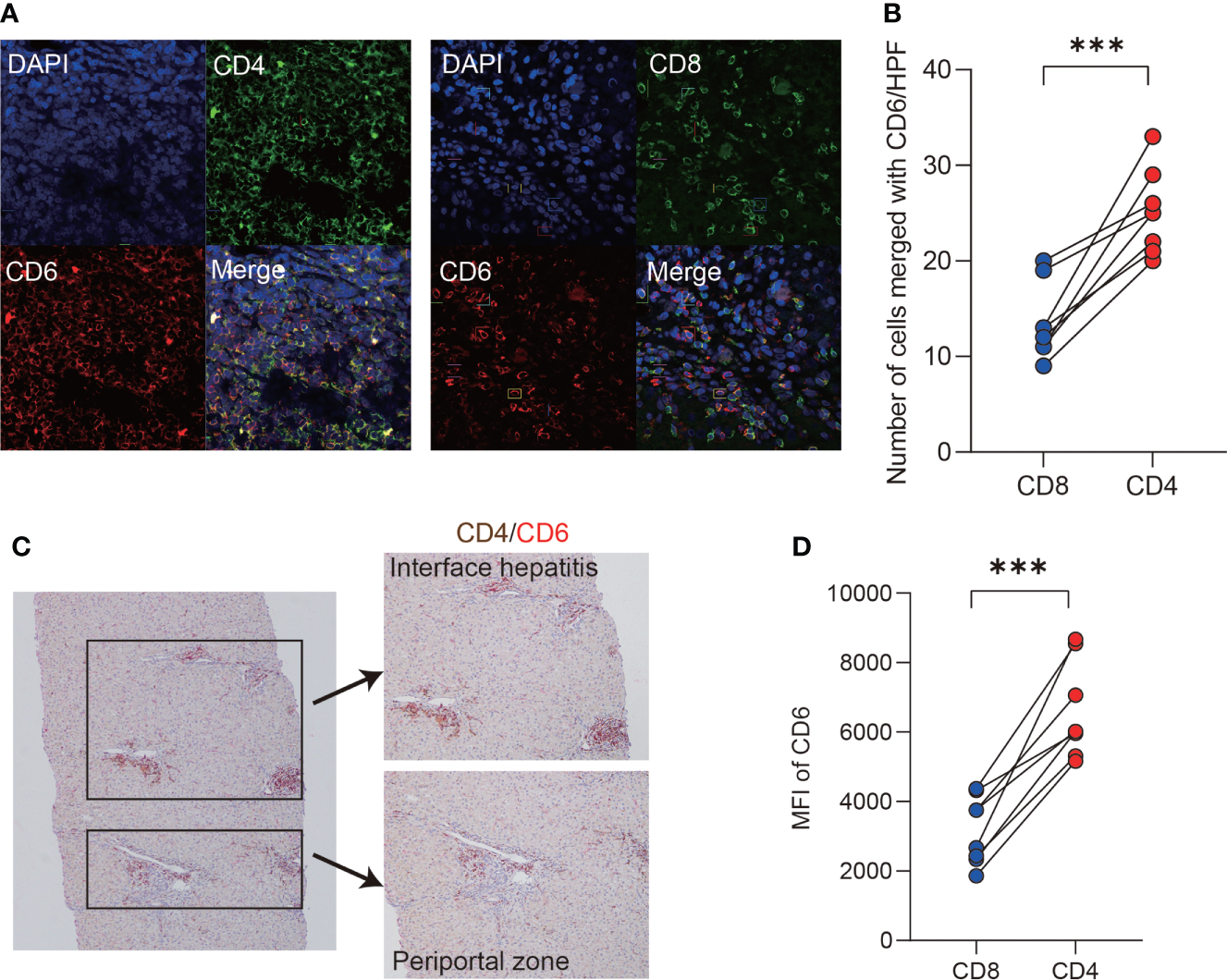 CD6 was mainly expressed on CD4+ T cells in AIH liver. (A, B) Representative confocal images and quantification analysis of CD4+CD6+, CD8+CD6+ cells using human liver biopsies from patients with AIH (n=8). (C) Representative dual-color immunohistochemistry images of CD4 (brown) and CD6 (red) using human liver biopsies from patients with AIH (n=10). (D) The expression of CD6 on CD4+ and CD8+ T cells of liver-infiltrating cells from explanted liver of AIH was analyzed by flow cytometry (n=8). MFI, mean fluorescent intensity, ***p < 0.001.