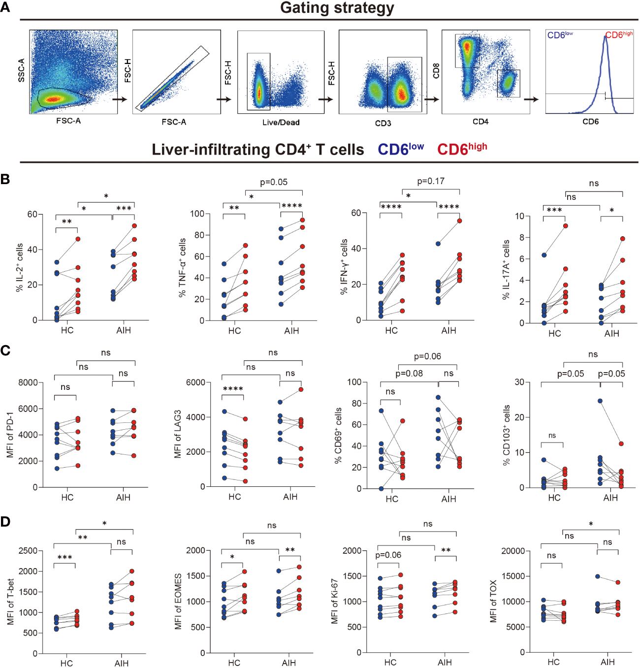 Intrahepatic CD6highCD4+ T cells demonstrated proinflammatory functions. Paired CD6high and CD6low cells among CD4+ T cells of liver-infiltrating cells from healthy donors (n=9) and patients with AIH (n=8) were analyzed by flow cytometry. (A) The gating strategy for grouping intrahepatic CD4+ T cells into CD6high and CD6low subsets. (B–D) The expression of intracellular cytokines, surface markers, and transcription factors on CD6high and CD6low subsets from the liver of HC (n=9) and AIH (n=8). *p < 0.05, **p < 0.01, ***p < 0.001, ****p < 0.0001, ns: not significant.