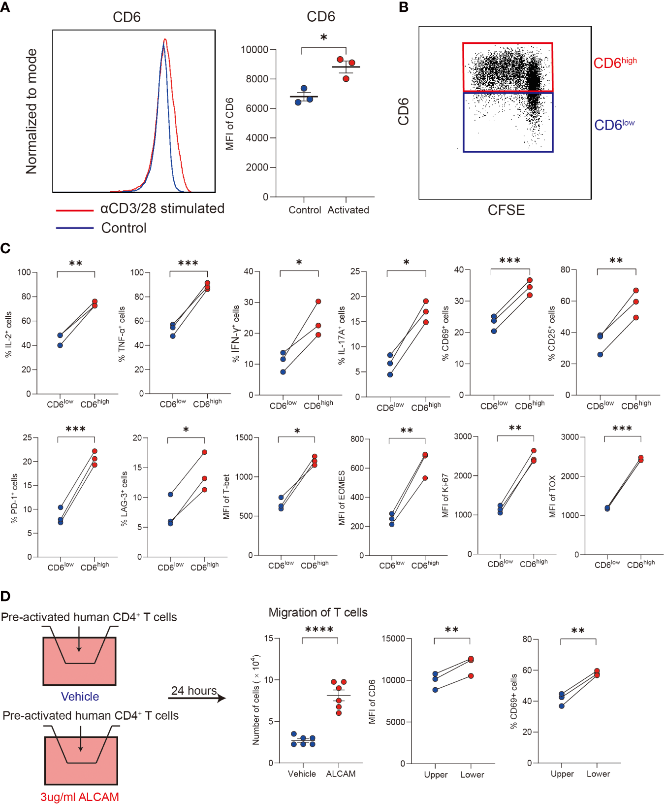 Primary human CD4+ T cells isolated from PBMCs of healthy donors were used to explore the immunological functions of CD6highCD4+ T cells in vitro. After stimulated with αCD3/28 for 3 days, a significant upregulation of CD6 was observed (Figure 5A). Compared with the CD6low subset, the CD6high subset demonstrated robust proliferation capacity (Figure 5B) and produced more IL-2, TNF-α, IFN-γ, IL-17A and expressed higher CD25 and CD69, which implicated its proinflammatory and activated status in vitro (Figure 5C).