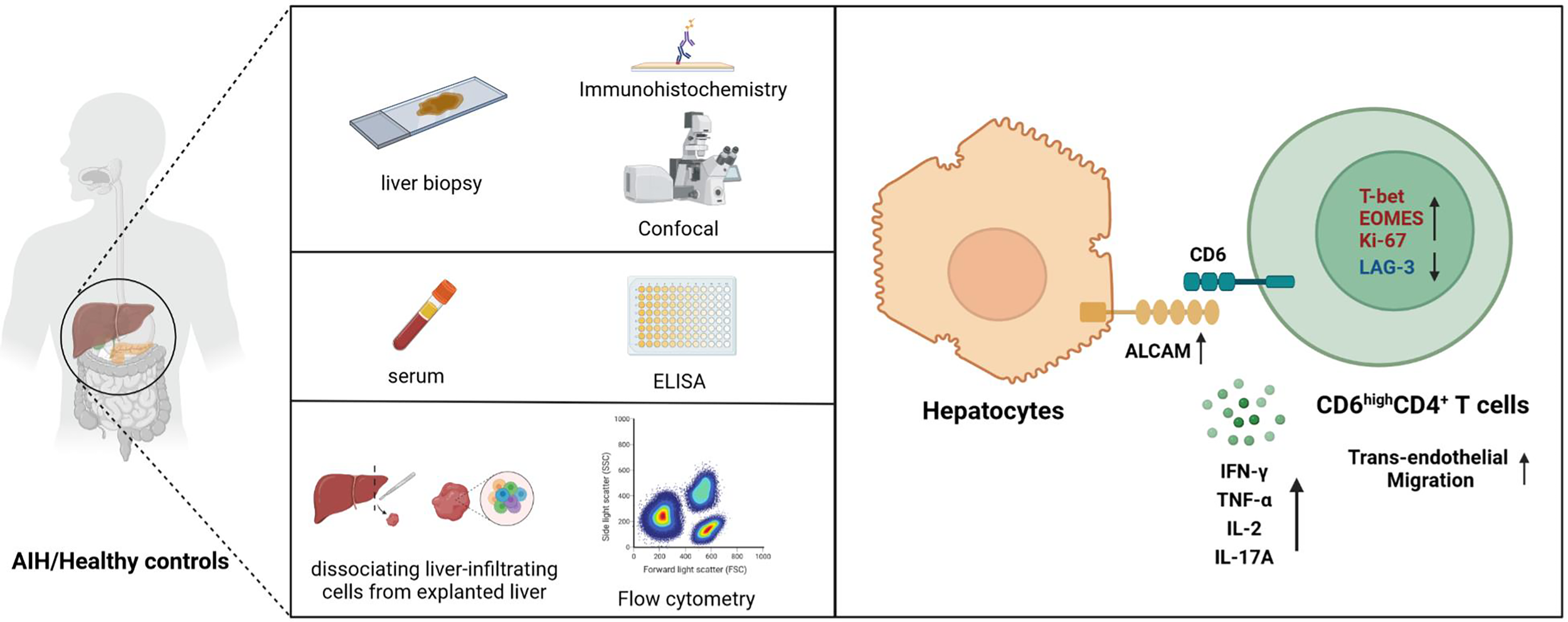 Schematic diagram for this study. Upregulated ALCAM on hepatocytes promoted the trans-endothelial migration of pathogenic CD6highCD4+ T cells, which further aggravated hepatic inflammation of patients with AIH. This study revealed a putative therapeutic approach for patients with AIH.