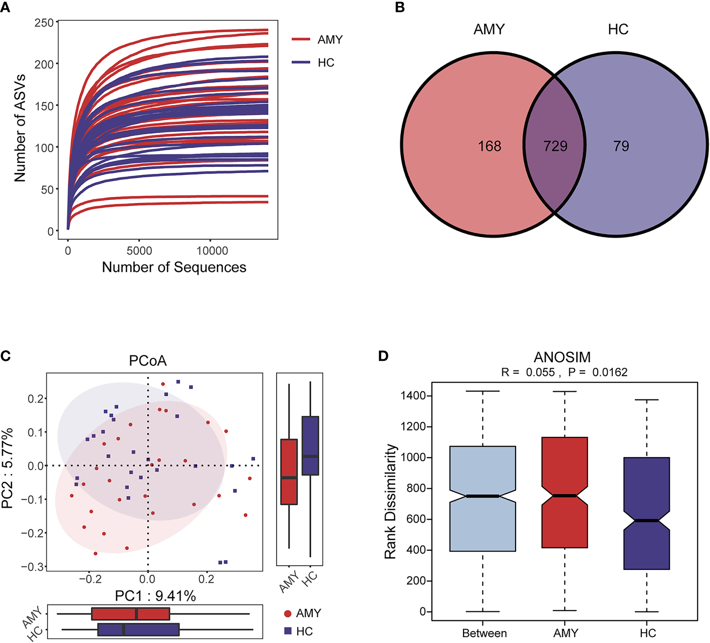 Data quality and gut microbiota diversity in patients with AL amyloidosis and HCs. (A) The rarefaction curve revealed the number of ASVs of each sample at different sequencing quantities. (B) The Venn diagram displaying overlap between the two groups showed that 729 of the 976 ASVs were shared between the AMY and HCs. A total of 168 of the 976 ASVs were unique to AMY. (C) β diversity based on PCoA analysis (Jaccard-binary distances) showed the fecal microbial communities in patients with AMY group and the HCs were clustered separately, indicating a good differentiation in taxonomic composition (Supplementary Table 3). (D) ANOSIM based on Jaccard-binary distances also showed that there were significant differences between the two groups (R = 0.055, p = 0.0162, Supplementary Table 3). AMY, patients with AL amyloidosis; HCs, healthy controls; ASVs, amplicon sequence variants; PCoA, principal coordinate analysis.
