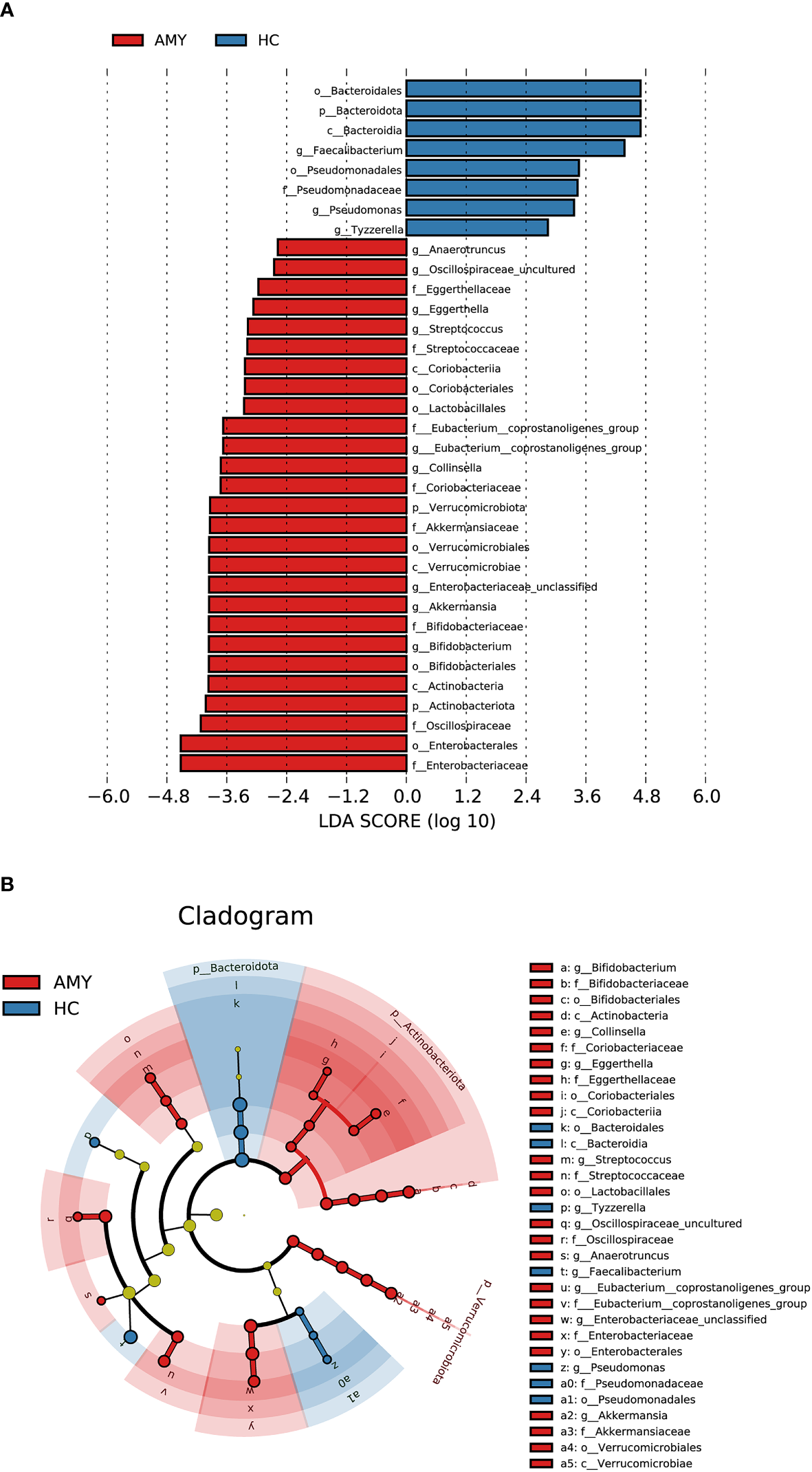 Composition and comparison of gut microbiomes in AMY (n = 27) and HCs (n = 27). Composition of the gut microbiota at the (A) phylum and (C) genus levels in AMY versus HCs. The significant different microbial community at the phylum level (B) and genus level (D) in AMY and HCs. The average abundance of each bacterium is depicted as the mean ± SE. P-values were calculated by a Wilcoxon rank-sum test and are shown in the Supplementary Tables 4, 5. *P < 0.05, **P < 0.01, ***P < 0.001. AMY, patients with AL amyloidosis; HCs, healthy controls.