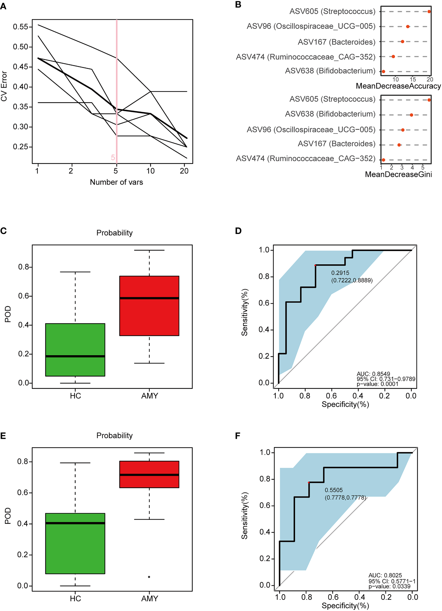 Amplicon sequence variants (ASVs) were identified with the DADA2 algorithm. The representative sequences for each ASV were annotated using the SILVA reference database (SSU138). QIIME feature classifier was used for species annotation, which was the species annotation plug-in of the QIIME 2 analysis process, and adopted the classify-sklearn algorithm. Alpha diversity metrics (ACE estimator, Chao 1 estimator, Shannon-Wiener diversity index and Simpson diversity index) were assessed by using Mothur v1.42.1. The non-parametric Mann-Whitney U test was used to test for significant differences between two groups. A comparison of multiple groups was done using a nonparametric Kruskal-Wallis test. Bray-Curtis, weighted UniFrac, unweighted UniFrac, and Jaccard-binary dissimilarity were calculated in QIIME. Principal coordinate analysis (PCoA) plots and PERMANOVA which were used to test for statistical significance between the groups using 10,000 permutations were generated in R (version 3.6.0) package vegan 2.5-7. The linear discriminant analysis (LDA) effect size (LEfSe) (32) was used to detect taxa with differential abundance among groups (lefse 1.1, https://github.com/SegataLab/lefse). A heatmap plot of the key ASVs identified by random forest models was generated by using the ‘pheatmap’ package of the R program. Probability of disease (POD) index was defined as the ratio between the number of randomly generated decision trees that predicted sample as “AL amyloidosis” and that of healthy controls. The identified optimal set of ASVs was finally used for the calculation of POD index for both the training and the testing cohort. A receiver operating characteristics (ROC) analysis was performed to measure the quality of the classification models by the R software package pROC. PICRUSt2 v2.4.1(https://github.com/picrust/picrust2/wiki) (33) was used to predict functional abundances in the Kyoto Encyclopedia of Genes and Genomes (KEGG) PATHWAY database based on 16S rRNA gene sequences. Spearman’s rank correlation was performed to explore correlations between ASVs and the clinical characteristics of patients with AL amyloidosis.