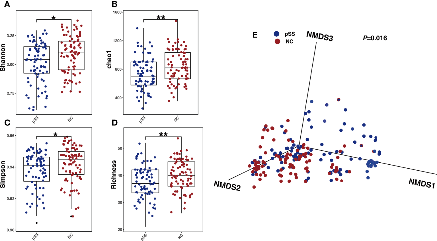 Gut microbial alterations in pSS patients compared with healthy controls. Comparison between Gut microbial profile of samples from healthy controls and pSS participants. (A) Shannon index between groups revealing microbial richness and particular evenness(alpha-diversity); P-values were calculated by Wilcoxon rank-sum test; (B) Simpson index levels of healthy controls and pSS participants; P-values were also calculated by Wilcoxon rank-sum test. (C) Richness of Gut microbial profile of samples in two groups with P-values calculated by Wilcoxon rank-sum test. (D) Chao 1 index and the number of species with P-values yielded from Wilcoxon rank-sum test.”**”: adjusted P-values “<0.01”,”*”:adjusted P-value “<0.05”. (E) NMDS analysis revealing β diversity based on Bray-Curtis Distance, with R2 and p value calculated from Adonis analysis.