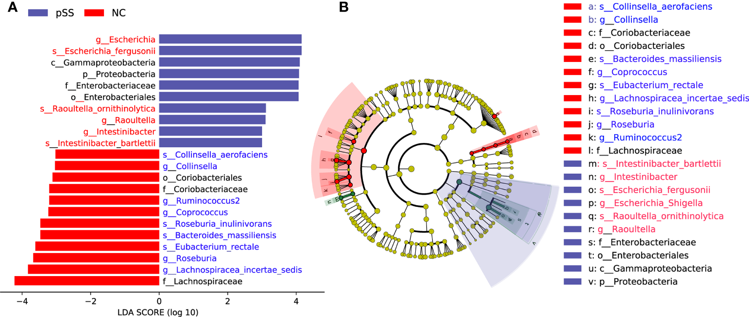 Identification of differential gut microbiota in pSS patients. Lefse analysis was performed to identify differentially abundant taxa, which are highlighted on the phylogenetic tree in cladogram format (B) and for which the LDA scores are shown (A).