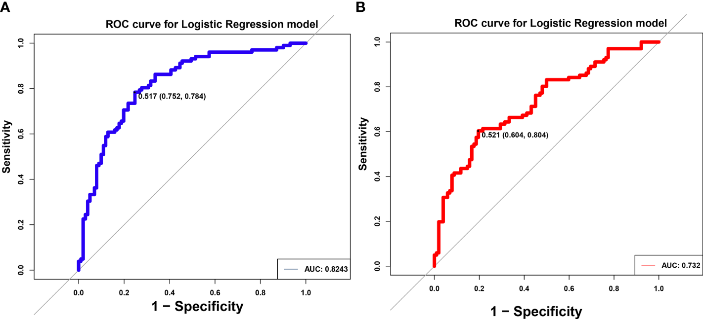 Identification of differential gut microbiota in pSS patients. ROC of logistic regression (LR) model using eight differential genus (A) and seven differential species (B). The AUC were 0.8243 and 0.732, separately.