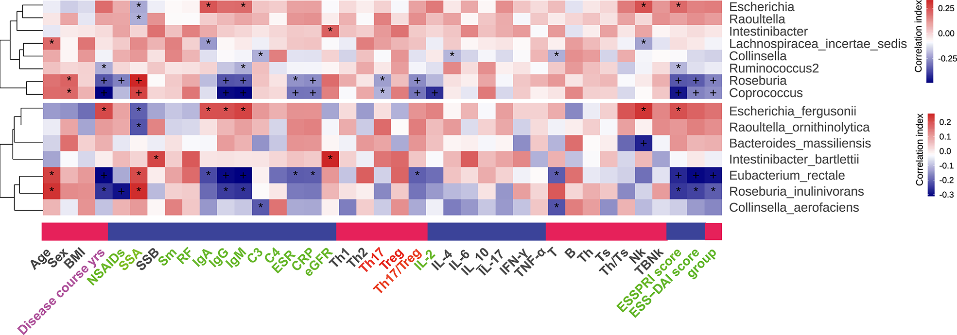 The association between clinical parameters and gut microbiome was analyzed. In genus level, Roseburia and Coprococcus were positively correlated with the level of SSA, and negatively correlated with ESR, CRP, IgG, IgM, Th17, Treg, Th17/Treg, ESSPRI score, ESSDAI score in the group of pSS patients. Similarly, in species level, Roseburia inulinivorans and Eubacterium rectale were positively correlated with the level of SSA, and negatively correlated with ESR, CRP, IgG, IgM, ESSPRI score, ESSDAI score and groups of pSS patients. Particularly, Eubacterium rectale was negatively correlated with the ratio of Th17/Treg (Figure 5). Our results thus reveal a robust relationship at taxa-level between Th17/Treg and microbiome composition that is independent of other factors.