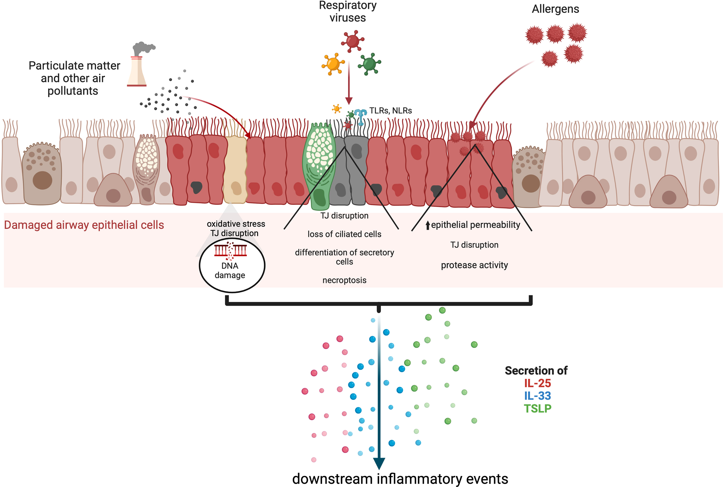 The secretion of alarmin cytokines in the airway epithelium may be triggered through multiple mechanisms which depend on the nature of the external insult. Asthma exacerbations can occur in response to air pollutants, allergens, and respiratory viruses. Various studies based on in vitrochallenged human bronchial epithelial cells and animal models indicate that IL-25, IL-33 and TSLP are released through cleavage of tight junctions (TJ), and necroptosis. Particulate matter and other air pollutants can trigger oxidative stress and the release of reactive oxygen and nitrogen species as well as DNA damage.