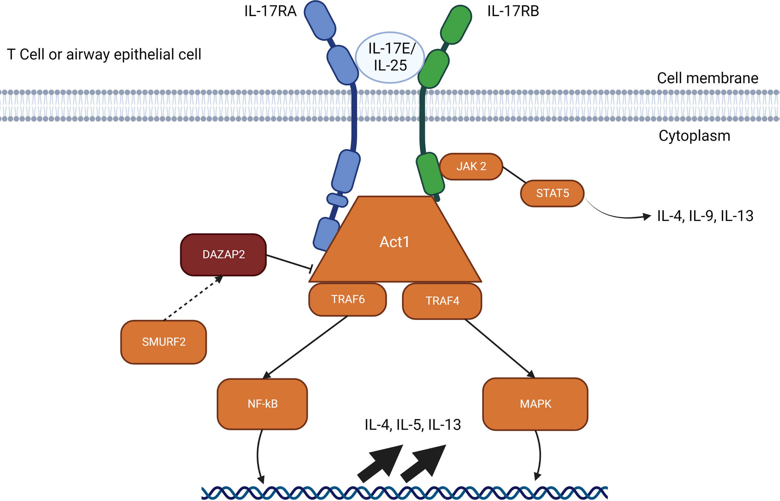 IL-25 signalling pathways through Act1. The IL-17E/IL-25 signaling pathway requires a heterodimer of IL-17RA and IL-17RB which allows interactions with Act1. Act1 recruits TRAF4 and TRAF6 which activates gene upregulation through NF-kB. SMURF2 removes the inhibitory effects of DAZAP2 which allows upregulation through MAP kinases and induces JAK2 to signal through STAT5 for IL-4, IL-9 and IL-13. The IL-25 pathways available represent the resolved pathways in T cell and airway epithelial cells, but IL-25 receptors are also found on mast cells, eosinophils, basophils, and other immune cells.