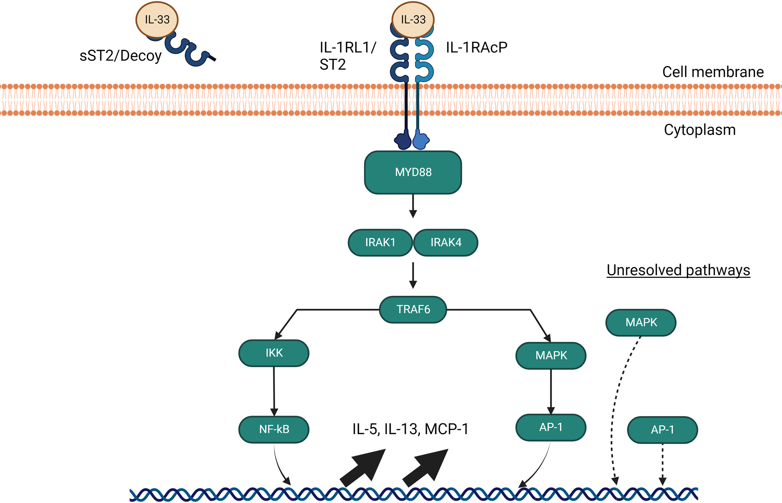 IL-33 signalling pathways through MyD88. The IL-33 signaling pathway requires a heterodimer of ST2 and IL-1 receptor accessory protein (IL- 1RAcP) to activate and signal through MyD88. If IL-33 avoids binding to soluble ST2 decoys, it signals through MyD88 to interact with IRAK1 and IRAK4, which in turns activate TRAF6 and leads to NF-kB and AP-1 gene upregulation of IL-5, IL-13 and MCP-1. AP-1 is also able to activate independently of MyD88 through an undiscovered pathway involving MAP kinases.