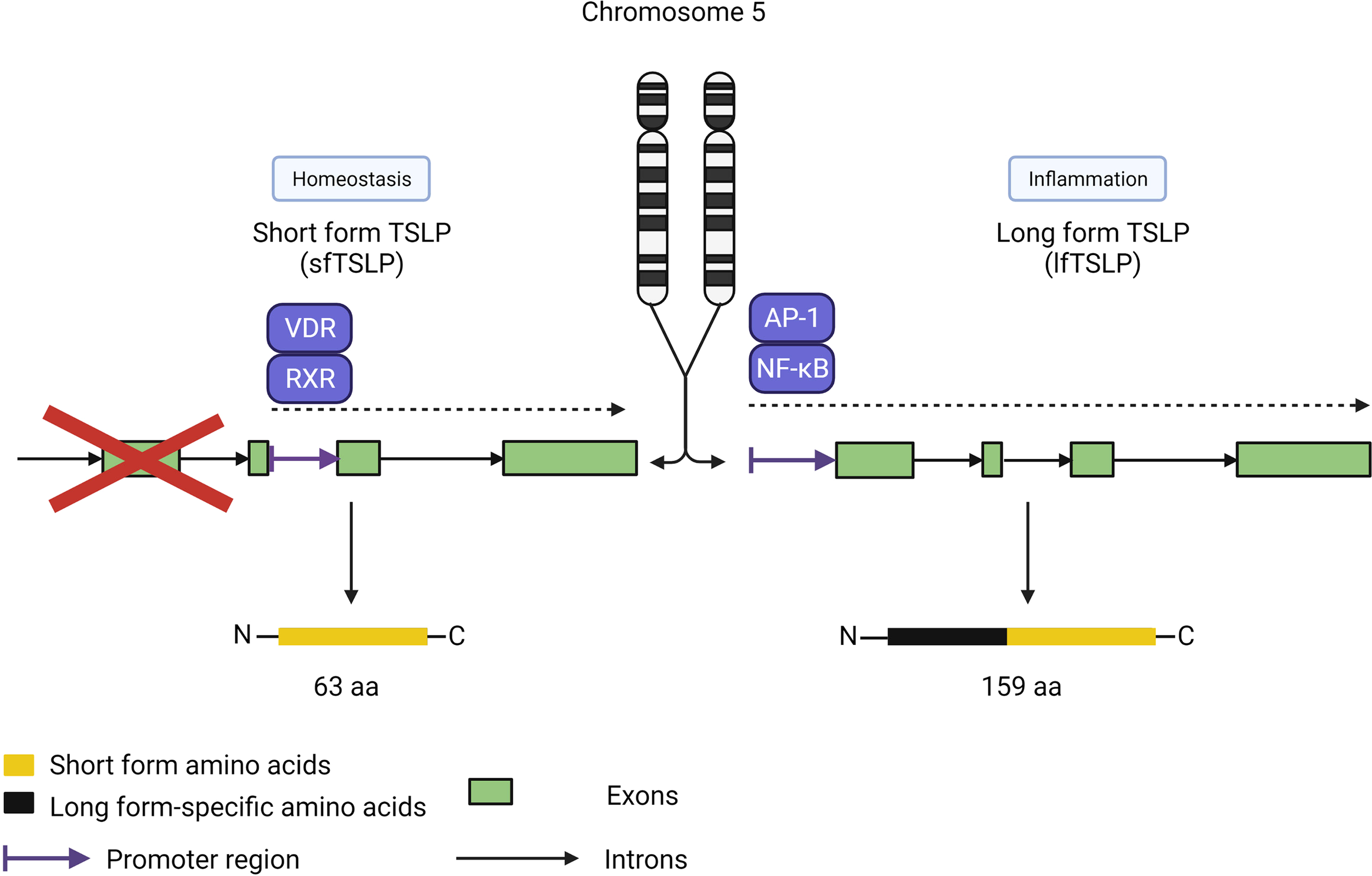 TSLP isoforms. TSLP has two isoforms covering two distinct roles: sfTSLP (63 amino acids) for homeostasis and lf TSLP (159 amino acids) for inflammatory responses. Each isoform is under the control of different promoter regions directed by distinct pathways, with the vitamin D receptor/retinoid X receptor pathway specific for sfTSLP expression and the AP-1/NF-kB pathway for lfTSLP. Both isoforms share the same Cterminus amino acid sequence but have distinct N-terminus sequences.