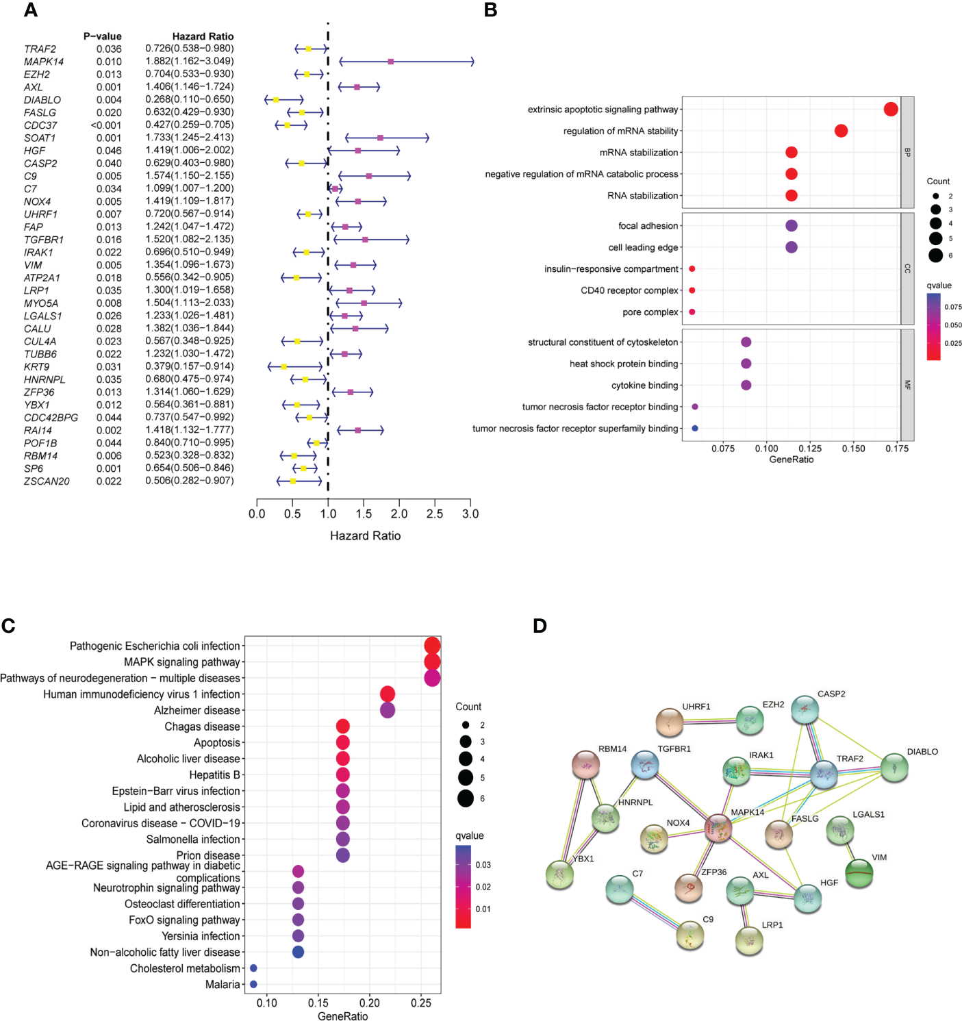 Identification and functional enrichment analysis of prognostic markers. (A) The forestmap of 35 prognostic markers of GC patients in the TCGA cohort. (B) The GO enrichment analysis of the prognostic markers. (C) The KEGG pathway analysis of the prognostic markers. (D) The PPI network was constructed through 35 prognostic markers. The interaction score was set to 0.4. GC, Gastric cancer; GO, Gene Ontology; KEGG, Kyoto Encyclopedia of Genes and Genomes; PPI, protein-protein interaction.