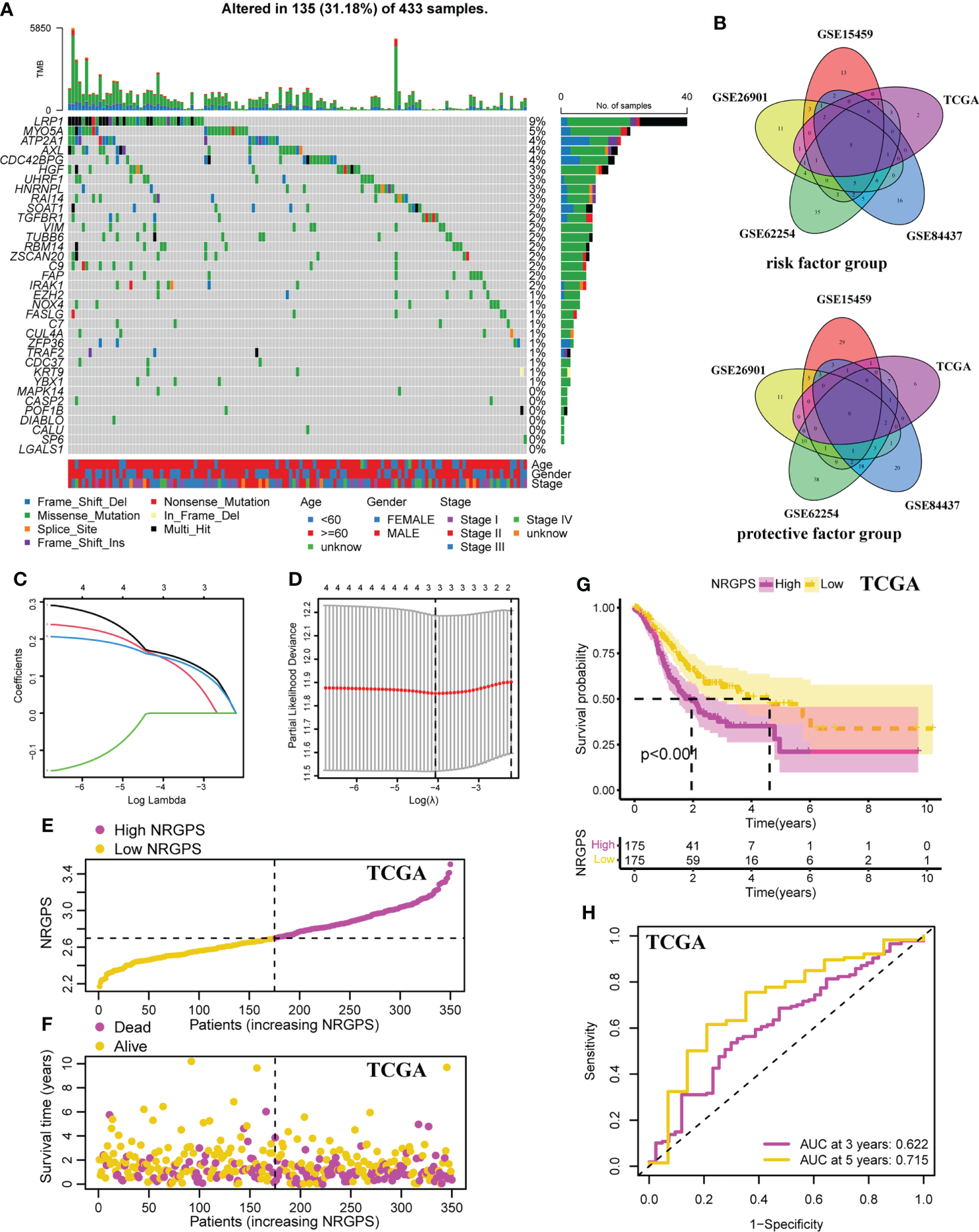 Development of the NRGPS System. (A) The waterfall plot of the prognostic associated genes mutations. (B) The venn plots of intersection of prognostic markers in five cohorts were shown. (C) LASSO coefficient profiles of prognostic markers. (D) The tuning parameters were cross-validated in the LASSO model. (E) Distribution of NRGPS in TCGA cohort. (F) Survival status in the high-NRGPS and low-NRGPS groups of TCGA cohort. (G) Kaplan-meier survival analysis in TCGA cohort. (H) The ROC curve of TCGA cohort verifies the prediction ability of this prediction model. LASSO, Least Absolute Shrinkage and Selection Operator. NRGPS, necroptosis-related gene prognostic score.