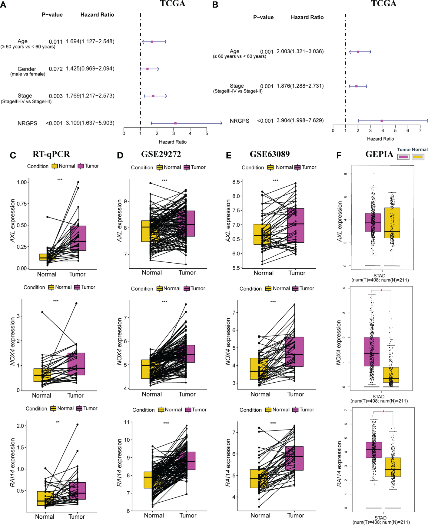 RT-qPCR was used to detect the relative mRNA level of 3 NRGs in 31 pairs of GC and adjacent normal tissues, Results from RT-qPCR revealed that the expression levels of AXL, RAI14, and NOX4 were higher in GC tissues than in nearby normal tissues next to cancer (Figure 4C), further demonstrating from the perspective of basic experiments that the reliability of NRGPS for determining GC prognosis. In addition, we also added three data sets and obtained the same trend results (Figures 4D–F).
