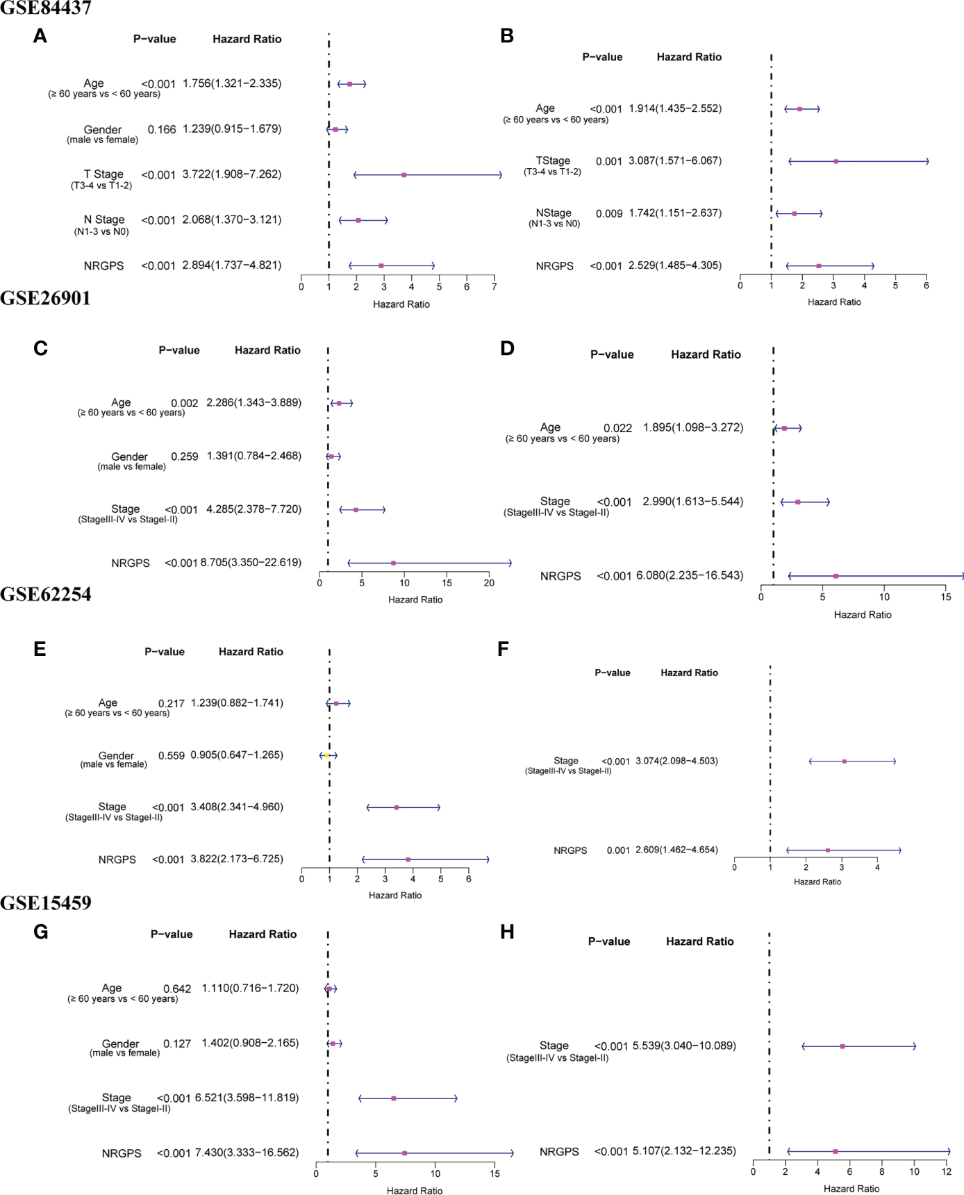 Independent prognostic analysis of prognostic model in GEO validation cohorts was performed. The forestplot of univariable Cox regression analysis of NRGPS and clinical characteristics in (A) GSE84437, (C) GSE62901, (E) GSE62254, (G) GSE15459. The forestplot of multivariable Cox regression analysis of NRGPS and clinical characteristics in (B) GSE84437, (D) GSE62901, (F) GSE62254, (H) GSE15459. NRGPS,necroptosis-related gene prognostic score.