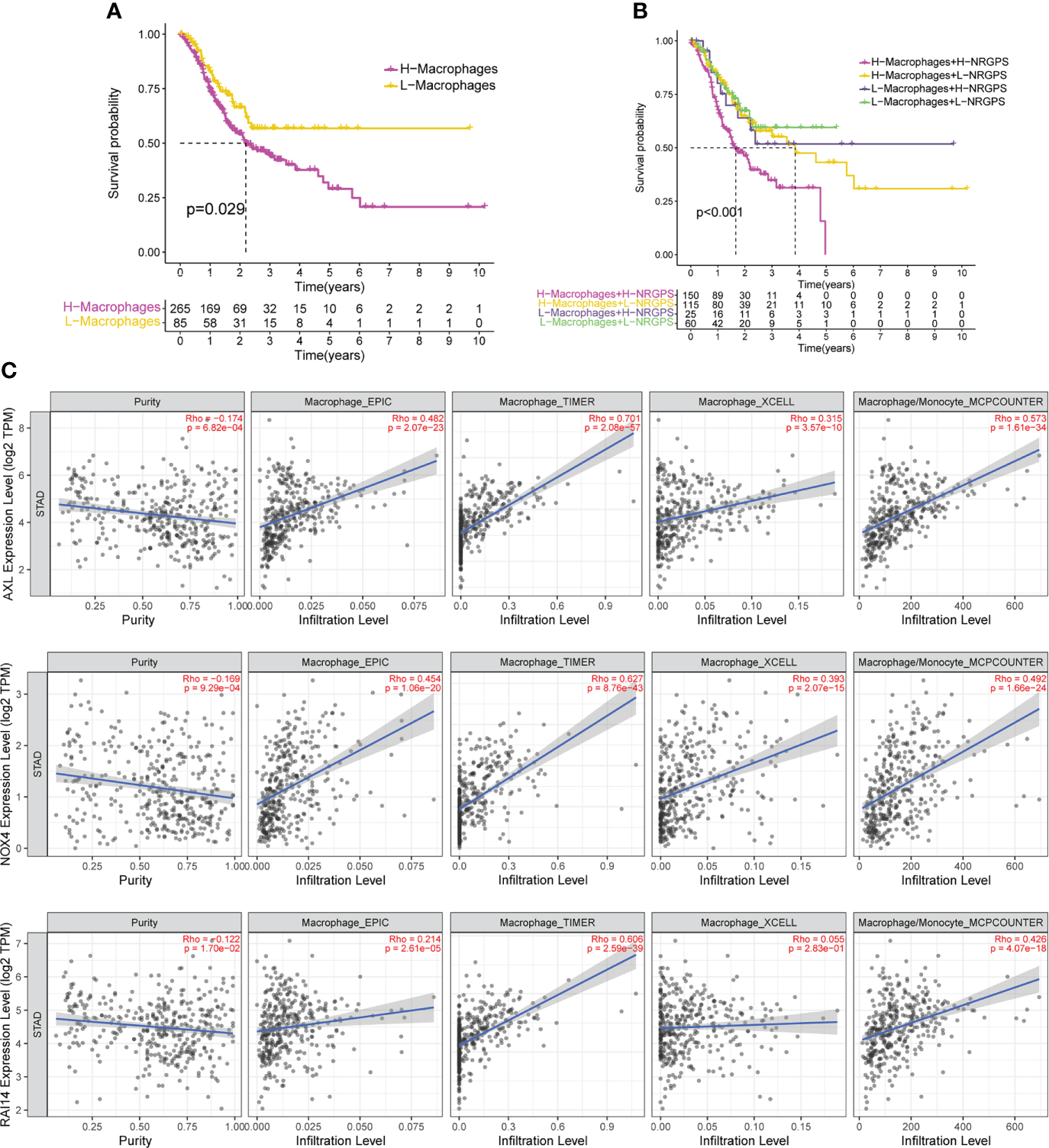 Since differences in the degree of macrophage infiltration were observed in the high- and low-NRGPS groups, the OS of GC patients with different macrophage infiltration was analyzed. It can be found from the results that the OS of GC patients with high macrophage infiltration is relatively low (Figure 9A). Next, we combined macrophages and NRGPS to analyze the survival of patients. High-macrophages-high-NRGPS patients had the lowest OS (Figure 9B). The results confirmed our speculations. Finally, we confirmed the close relationship between the three candidate genes and macrophages through the algorithms of EPIC, TIMER, xCELL and MCPCOUNTER (Figure 9C).