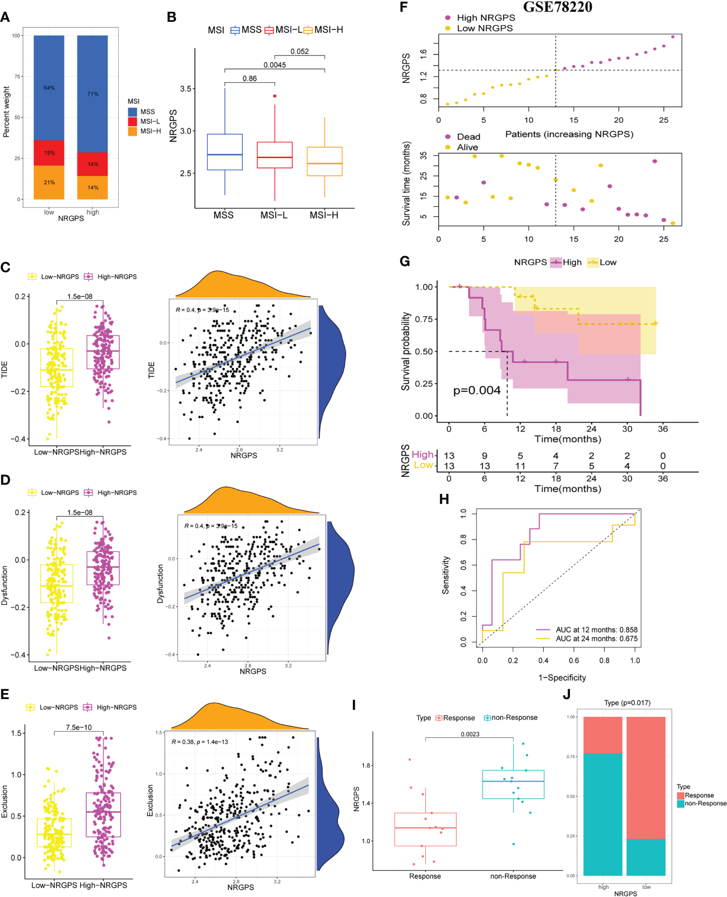 Differences in MSI statuse, TIDE score between high-NRGPS and low-NRGPS groups in the TCGA cohort. (A) Distribution of patients with different MSI statuses in high- and low-NRGPS groups. (B) The boxplot of NRGPS differences between groups with different MSI. (C) The boxplots of differences between TIDE in low- and high-NRGPS groups and correlation analysis of TIDE with NRGPS. (D) The boxplots of differences between Immune Dysfunction scores in low- and high-NRGPS groups and correlation analysis of Immune Dysfunction scores with NRGPS. (E) The boxplots of differences between Immune Exclusion scores in low- and high-NRGPS groups and correlation analysis of Immune Exclusion scores with NRGPS. (F) The distribution of NRGPS and the survival status of the high- and low-NRGPS groups. (G) Kaplan-meier survival analysis in GSE78220 cohort. (H) The ROC analysis of GSE78220 cohort. (I) The boxplot of NRGPS differences between immunotherapy responde and non-responde groups. (J) Distribution of patients who responded and did not respond to immunotherapy in the high- and low-NRGPS groups. MSI, Microsatellite Instability; TIDE, Tumor Immune Dysfunction, and Exclusion; NRGPS, necroptosis-related gene prognostic score, ROC, receiver operating characteristic.