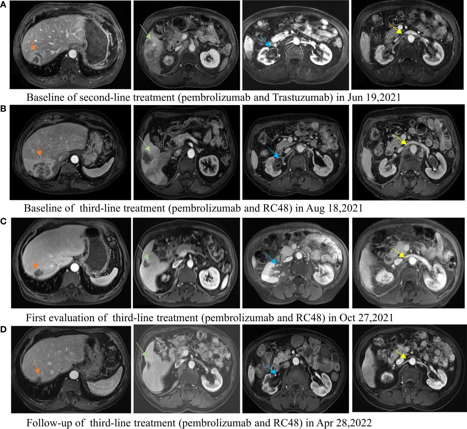 Figure 1 Lesions of the liver, ureteropelvic calyces, and lymph node change during the second-line treatment of pembrolizumab combined with trastuzumab and third-line treatment of pembrolizumab combined with RC48. (A) The baseline MRI image of the second-line treatment. (B) The image of tumor progression after second-line treatment, and the baseline image of the third-line treatment. The hepatic metastasis in the right posterior upper lobe was significantly enlarged and the other lesions reduced after second-line treatment. (C) The first efficacy evaluation after third-line treatment for 2 months: partial response. All tumor foci are reduced. (D) The image evaluation after third-line treatment for 8 months: partial response.